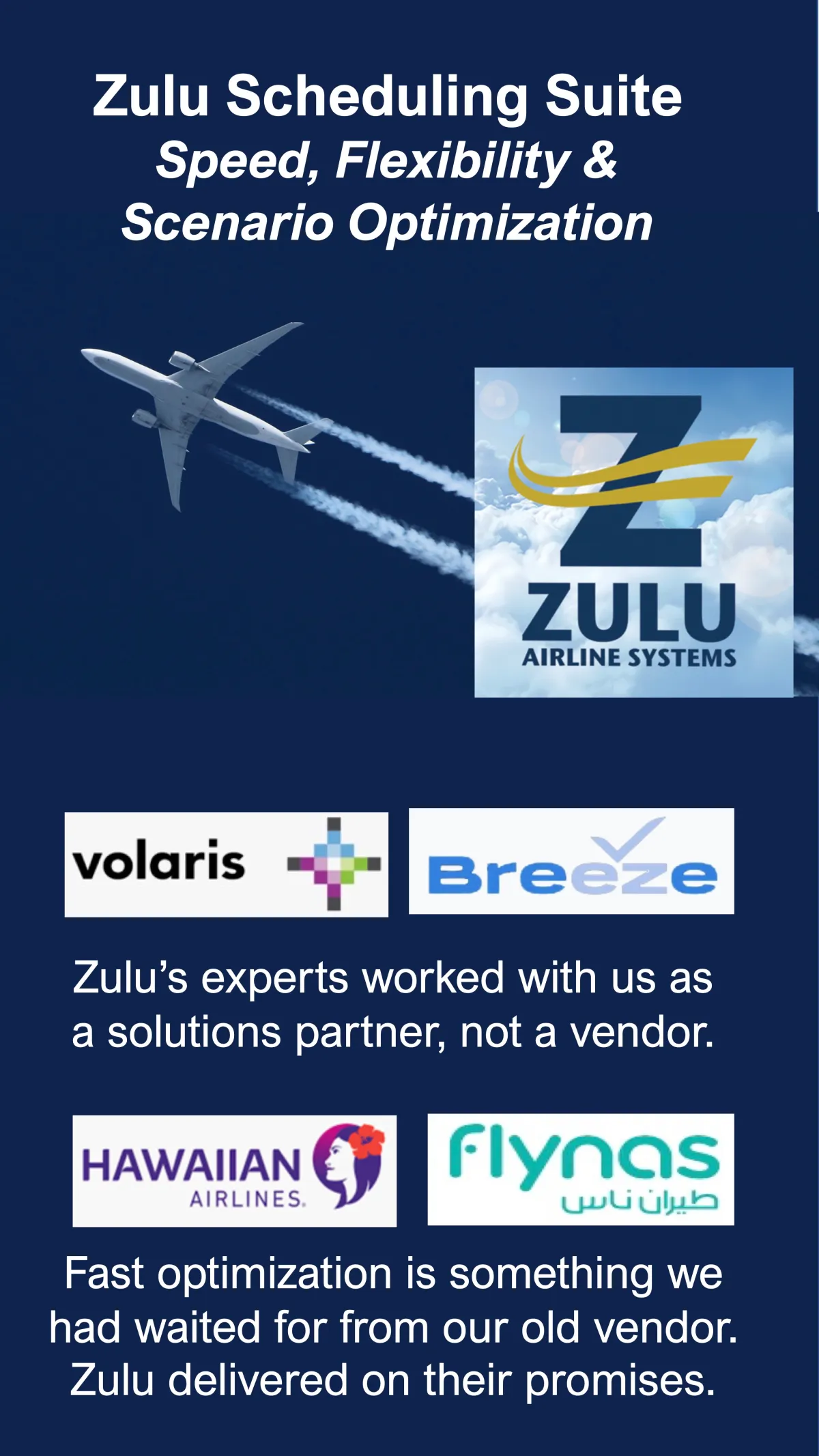 Zulu's software-as-a-service (SaaS) makes full-featured, economical solutions affordable for all airlines with a level of support and innovation needed to meet today’s dynamic planning needs. With cloud-technology, Zulu is easy to implement and integrate with other systems. Zulu's customer success team enables a transition to be done in just a few days without requiring resources from your internal IT group. We continue to be available 24x7 with years of scheduling and slots expertise to answer your questions. Zulu is easy to learn so that new users are up to speed quickly.