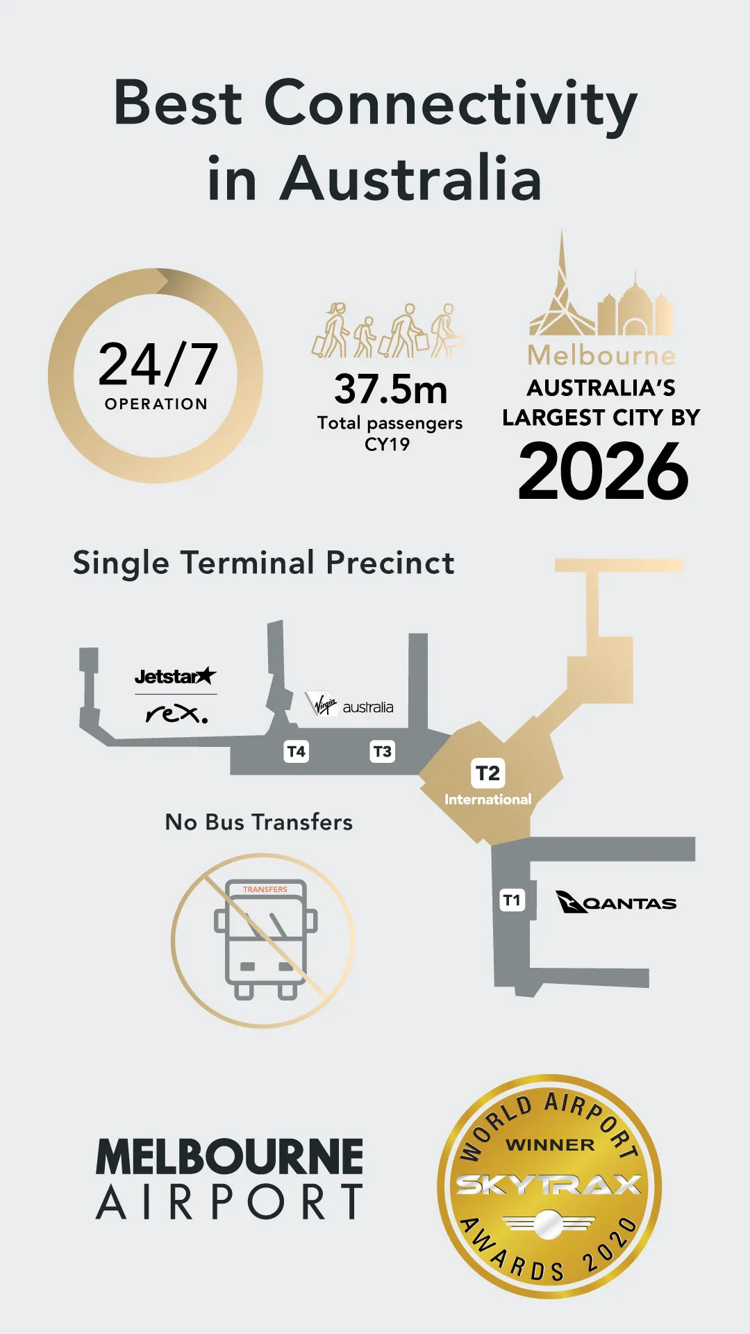 Melbourne Airport is Australia’s largest 24/7 curfew free, handling 37.5 million passengers in the 2019 calendar year (prior to the COVID-19 pandemic). A single terminal precinct offering the best connectivity proposition and lowest MCT in Australia. Fastest growing major airport in Australia for domestic and international passenger growth (BITRE). The second busiest airport in Australia for RPT operations (BITRE). Projected to be Australasia’s largest city by 2026, Melbourne Airport sits on a vast land bank that stretches 2,663 hectares, containing the largest business park in the country (410 hectares).