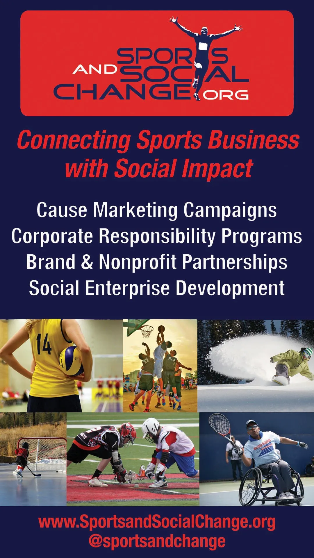 The dynamic global platform of sport has the capacity to unite a broad range of audiences, and focus their time and energy to address critical social issues. We harness this unique opportunity by channeling the industry's talent and resources into innovative brand & nonprofit partnerships, cause marketing campaigns, corporate social responsibility initiatives, and empowerment on social enterprise models in sports business.
