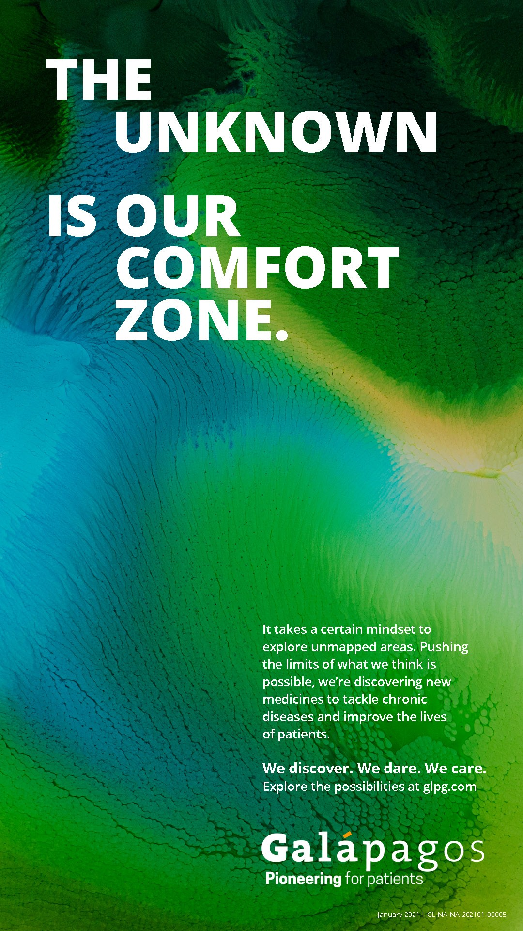 We are Galapagos UK, a pioneering biotechnology company, with the ambition of becoming a leading biopharmaceutical company, focused on making a difference to people with inflammatory and fibrotic diseases. With our pioneering spirit we aim to make a lasting, positive contribution to society by delivering breakthrough medicines we have discovered to patients. We believe in ‘we’ not ‘us’ and together with the inflammation healthcare community, we will continue to push the possibilities of our work to tackle chronic disease and improve the lives of patients.