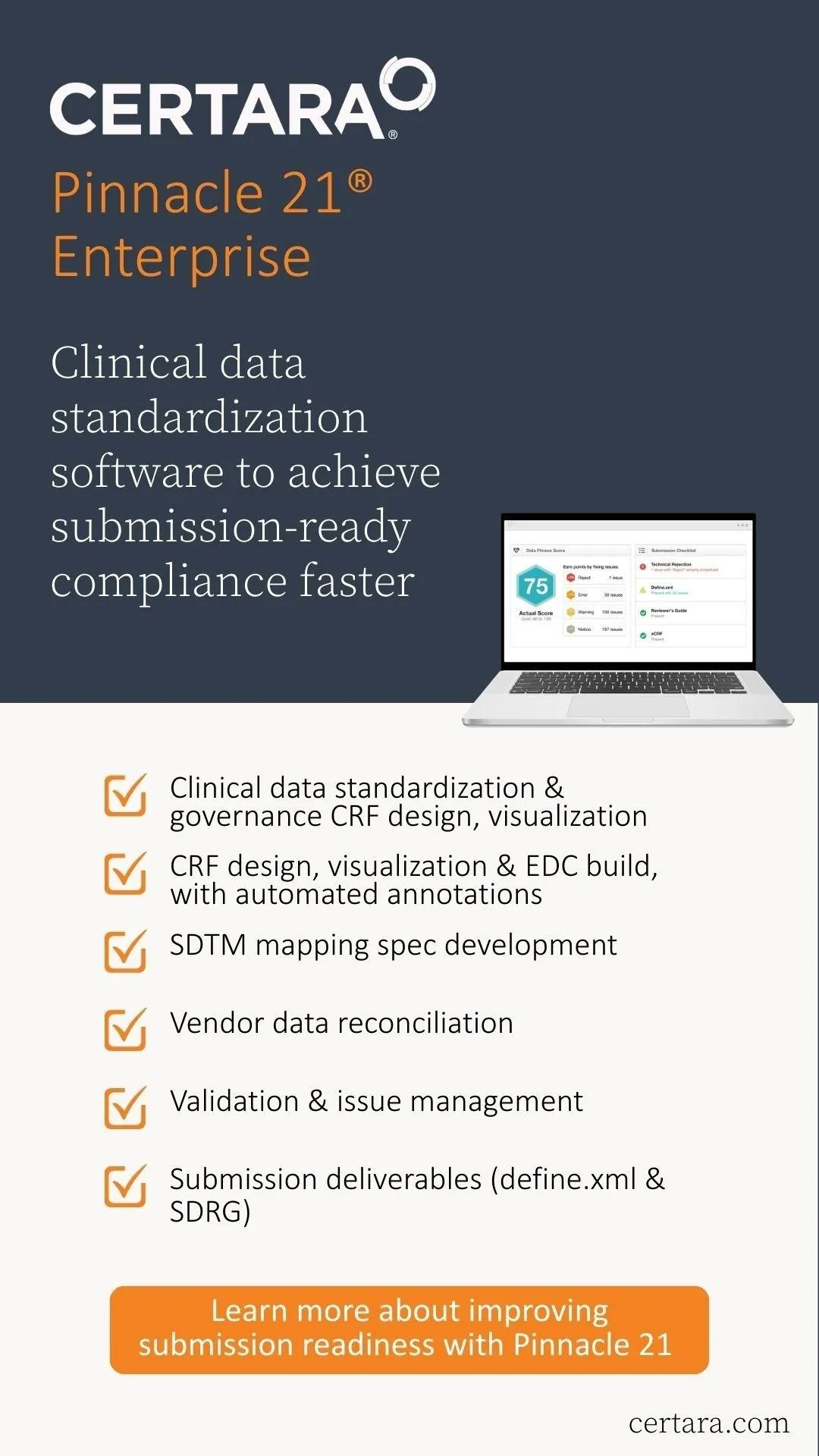 At the core of Certara’s ecosystem is Pinnacle 21 Enterprise® - the industry leading clinical data standardization and validation platform trusted by sponsors and CROs worldwide.