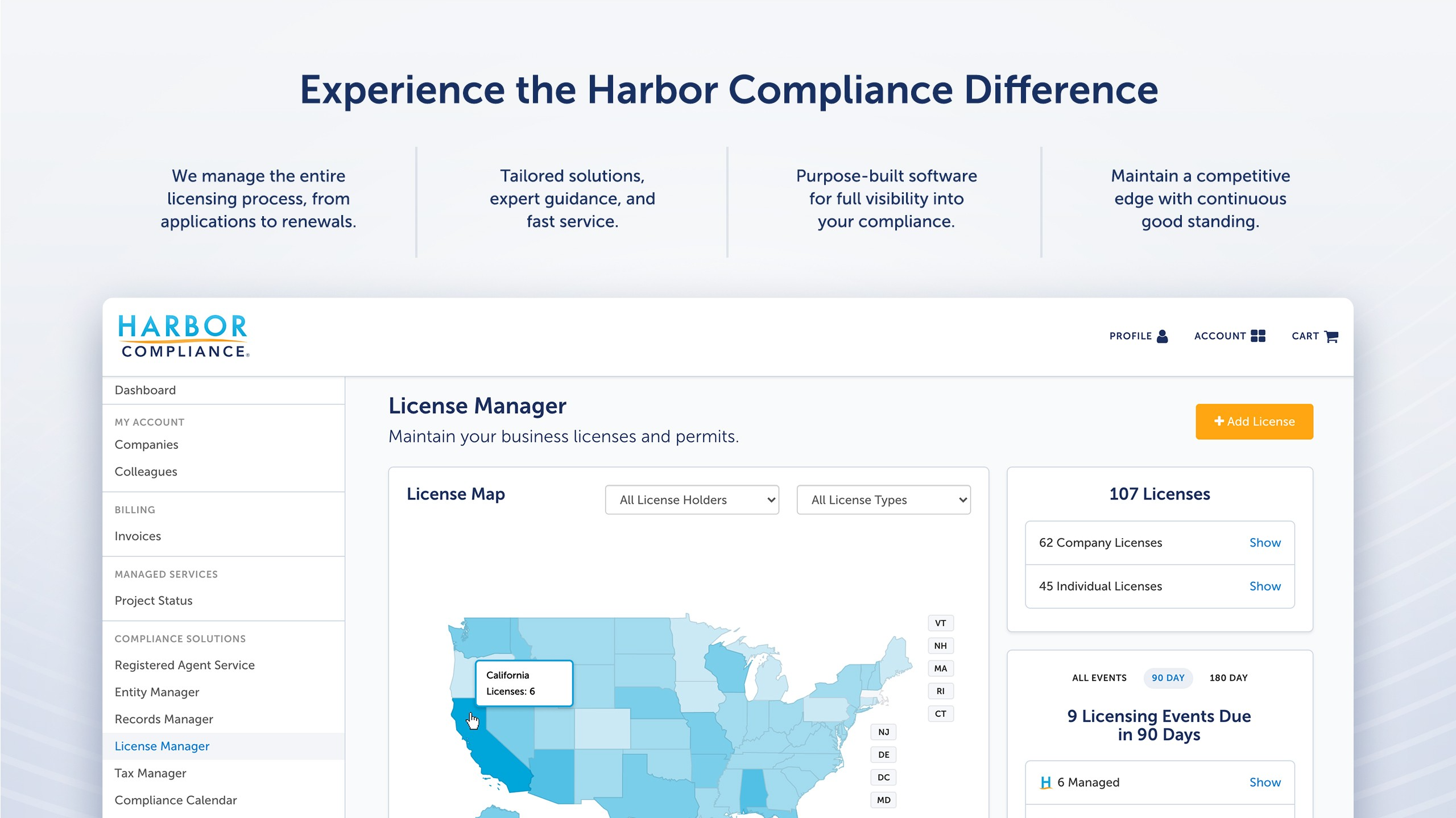 Founded by a team of government licensing specialists and technology trailblazers, Harbor Compliance is a leading provider of compliance solutions for companies of all types and sizes. Since 2012, we have helped more than 25,000 clients apply for, secure, and maintain licensing across all industries.
