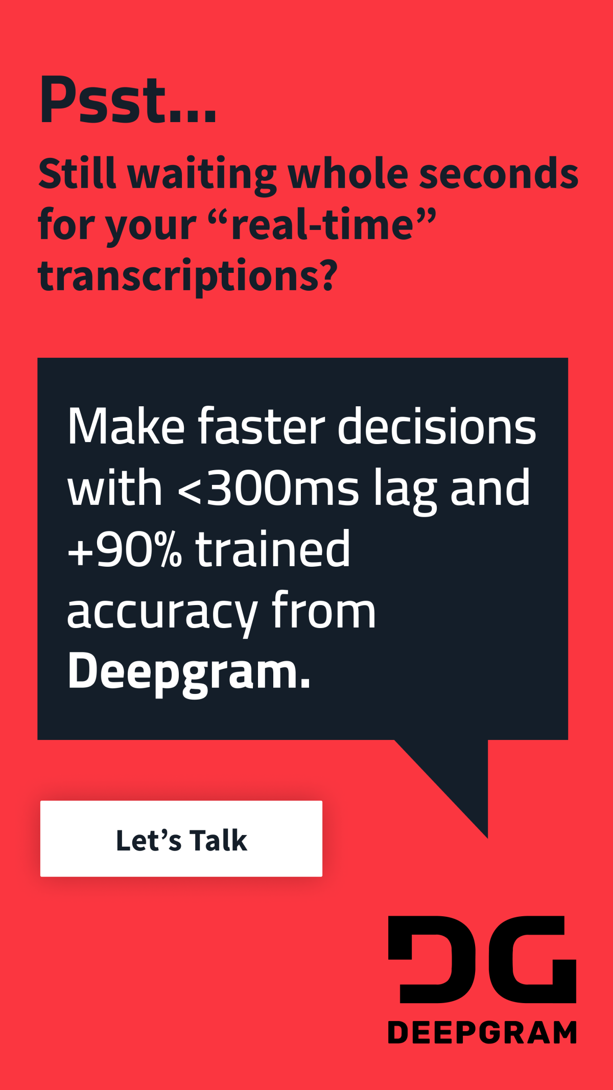 Deepgram is the world’s most accurate Speech Recognition platform. With its patented deep neural network, ease to use API, and state-of-the-art model training capabilities, Deepgram enables organizations to easily embed AI into their business. By unlocking accurate speech data insights, organizations can create delightful customer experiences, improve productivity and generate new business channels faster, more reliably and cost-effectively than ever before. For more information, visit our website.