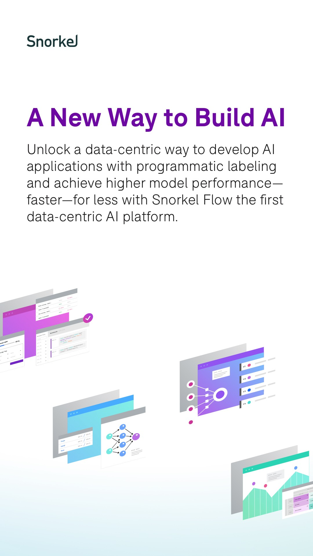 Snorkel AI is a technology startup that empowers data scientists and developers to turn data into accurate and adaptable AI applications fast with Snorkel Flow, a first-of-its-kind data-centric development platform, powered by programmatic labeling. Snorkel Flow reduces the time, cost, and friction of labeling training data so data science and development teams can more easily build and scale AI models to deploy more meaningful applications. Incorporating human judgment into the AI process through subject-matter experts is made more efficient and scalable leading to more ethical, responsible outcomes.