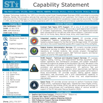 Strategic Technology Institute, Inc. (STi) is a minority owned small disadvantaged business (SDB) providing effective and innovative solutions in Maintenance, Repair, & Overhaul (MRO), logistics, Safety, Reliability, Maintainability, & Quality Assurance (SRM&QA), IT & cybersecurity, and project management & control. Our management system is AS9100D-certified, ISO 14001:2015-certified, and ISO 9001:2015-certified with respect to business management and program management, which deeply influences our consistent “Safety First, Quality Always” culture.