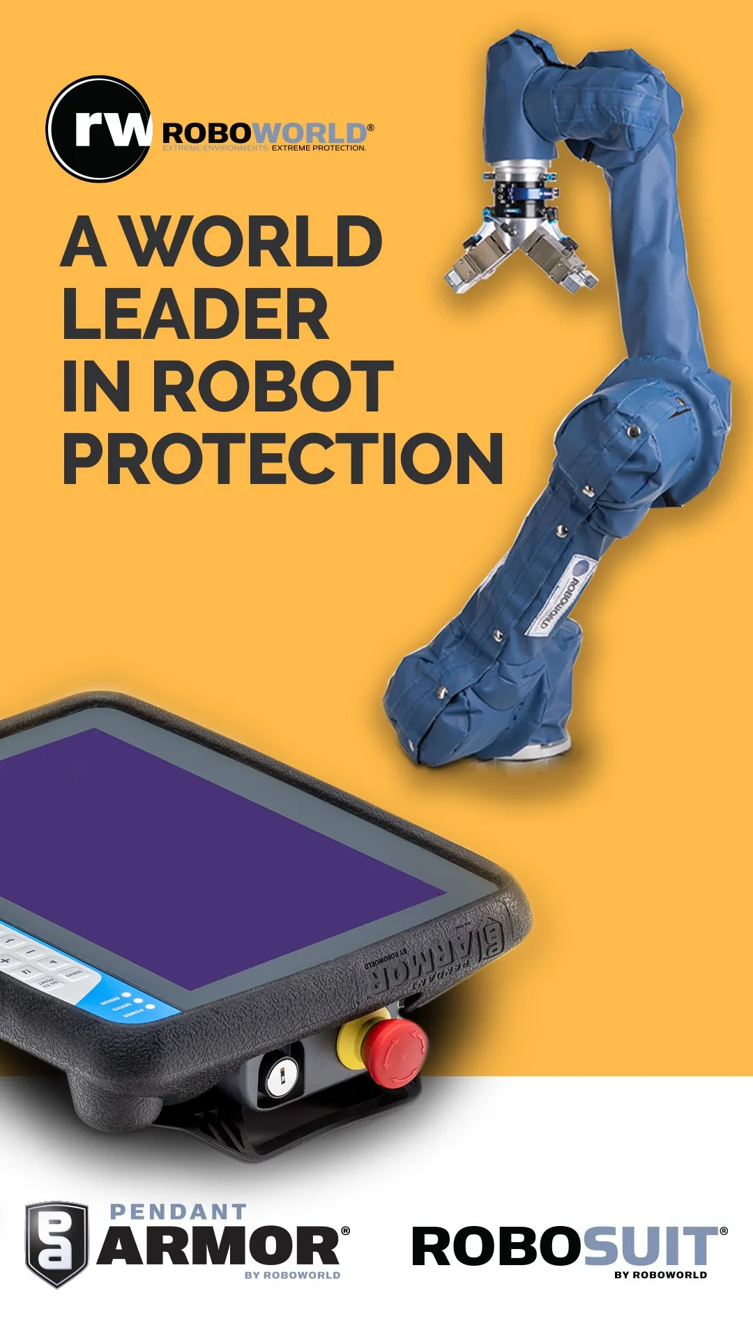 In 2015, Roboworld Molded Products took protection one-step further by solving an industry-wide problem. We introduced the world’s first shock absorbing, chemical resistant bumper to protect teach pendants from damage if they are accidentally dropped or pulled from a work surface. Today, Pendant Armor® is available for eight OEM-manufacturers, and over 20-different models of teach pendants.