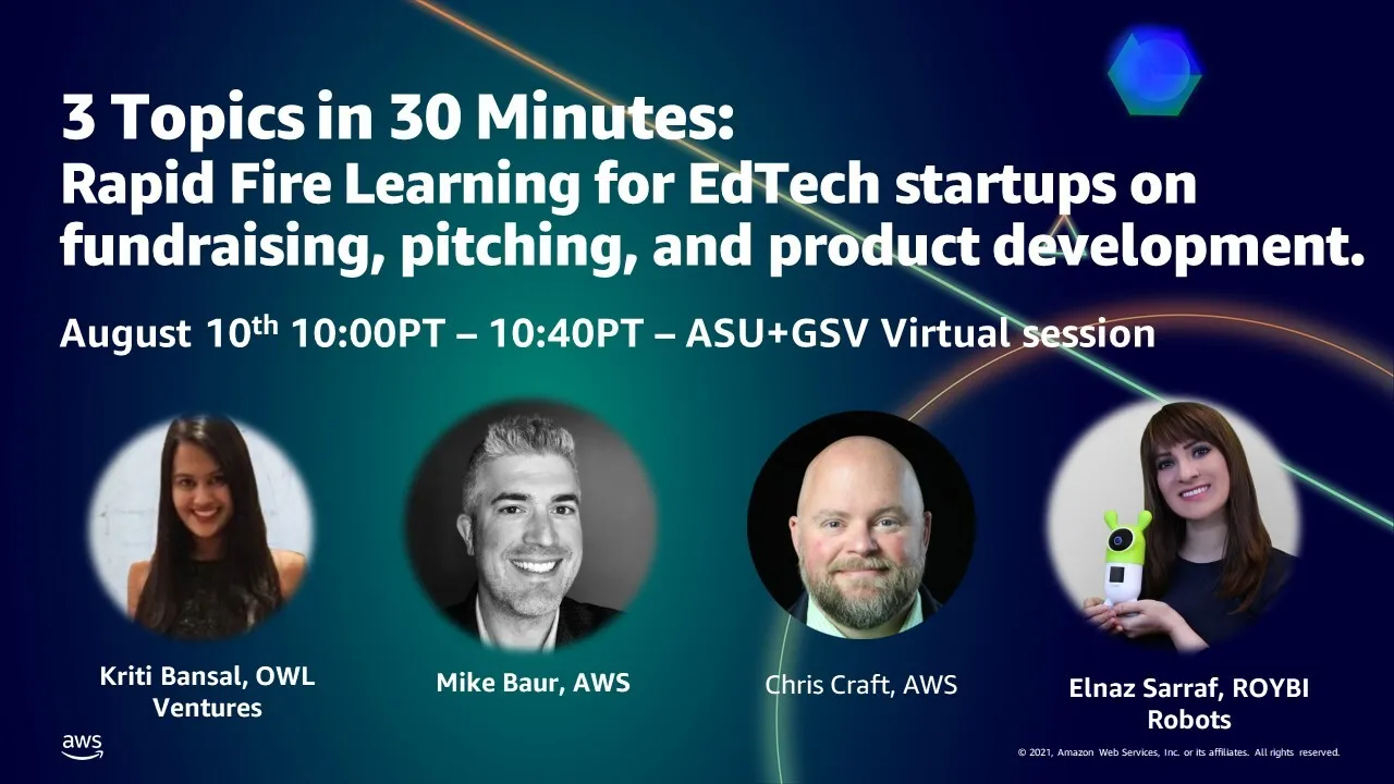 In this session you will learn valuable informtion from the leading education technology accelerator, AWS EdStart, and its collaborators. Using a rapid fire format of two minute presentations, host Dr. Chris Craft, Program Manager, AWS EdStart, will share the mic with industry veterans; Elnaz Sarraf, Founder and CEO, ROYBI, Kriti Bansal, Owl Ventures, and Mike Baur, EdTech Strategy, Amazon Web Services (AWS), to discuss best practices and experience on creating the perfect pitch, the top items investors are looking for in startup talent and how your technology infrastructure can either be an asset or a barrier. If you are a growing EdTech, don't miss it!