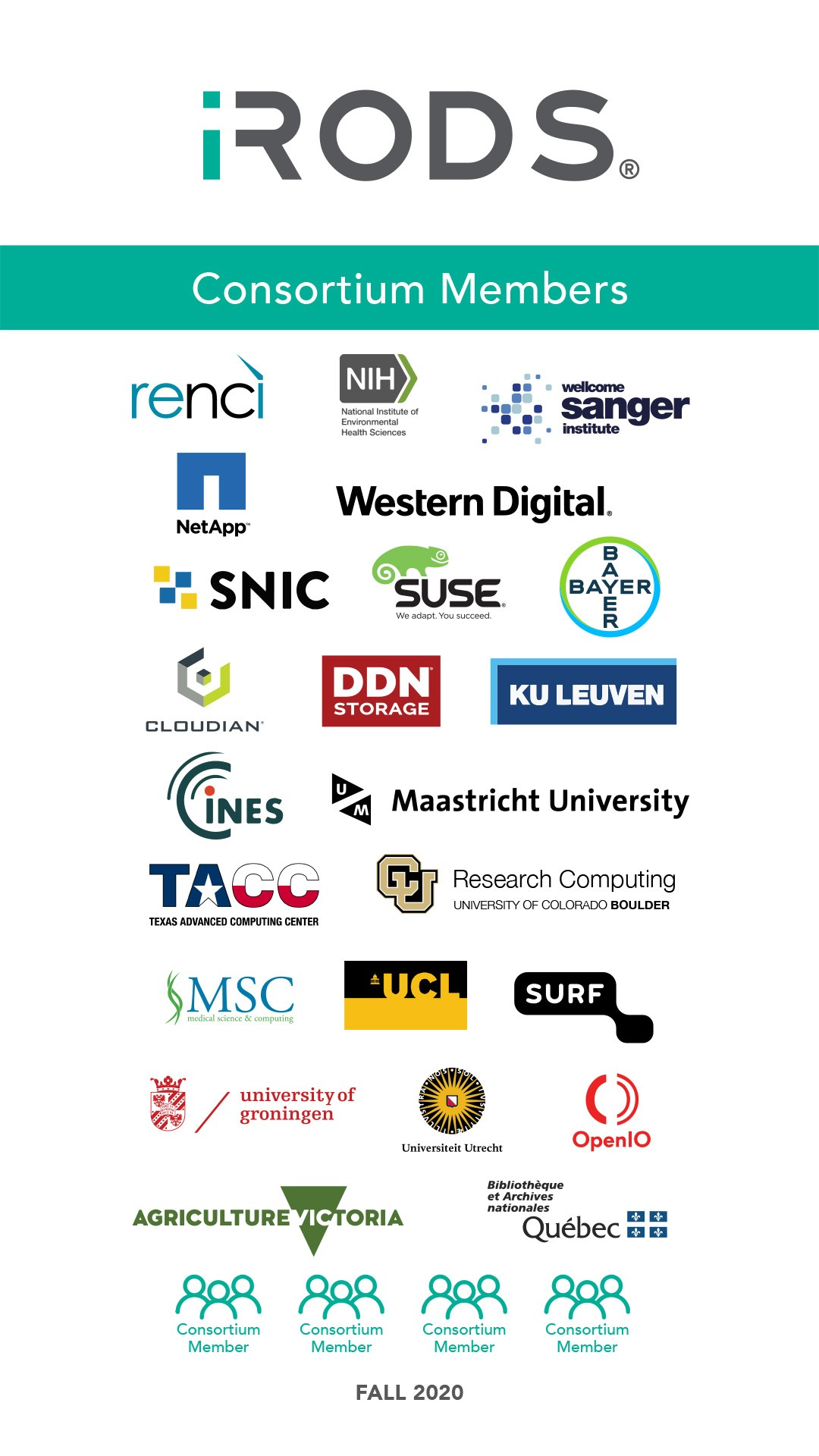 iRODS is open source data management software used by research, commercial, and governmental organizations worldwide. iRODS is released as a production-level distribution aimed at deployment in mission critical environments. It virtualizes data heterogeneous storage resources, supports a metadata catalog for annotation, and includes a flexible policy engine which provides a programmatic surface into current or future infrastructure. This future-proof technology allows managers to guarantee and audit activity within a single logical namespace. iRODS has been deployed in thousands of locations, across industries as diverse as oil and gas, life sciences, physical sciences, archives and records management, and media and entertainment.