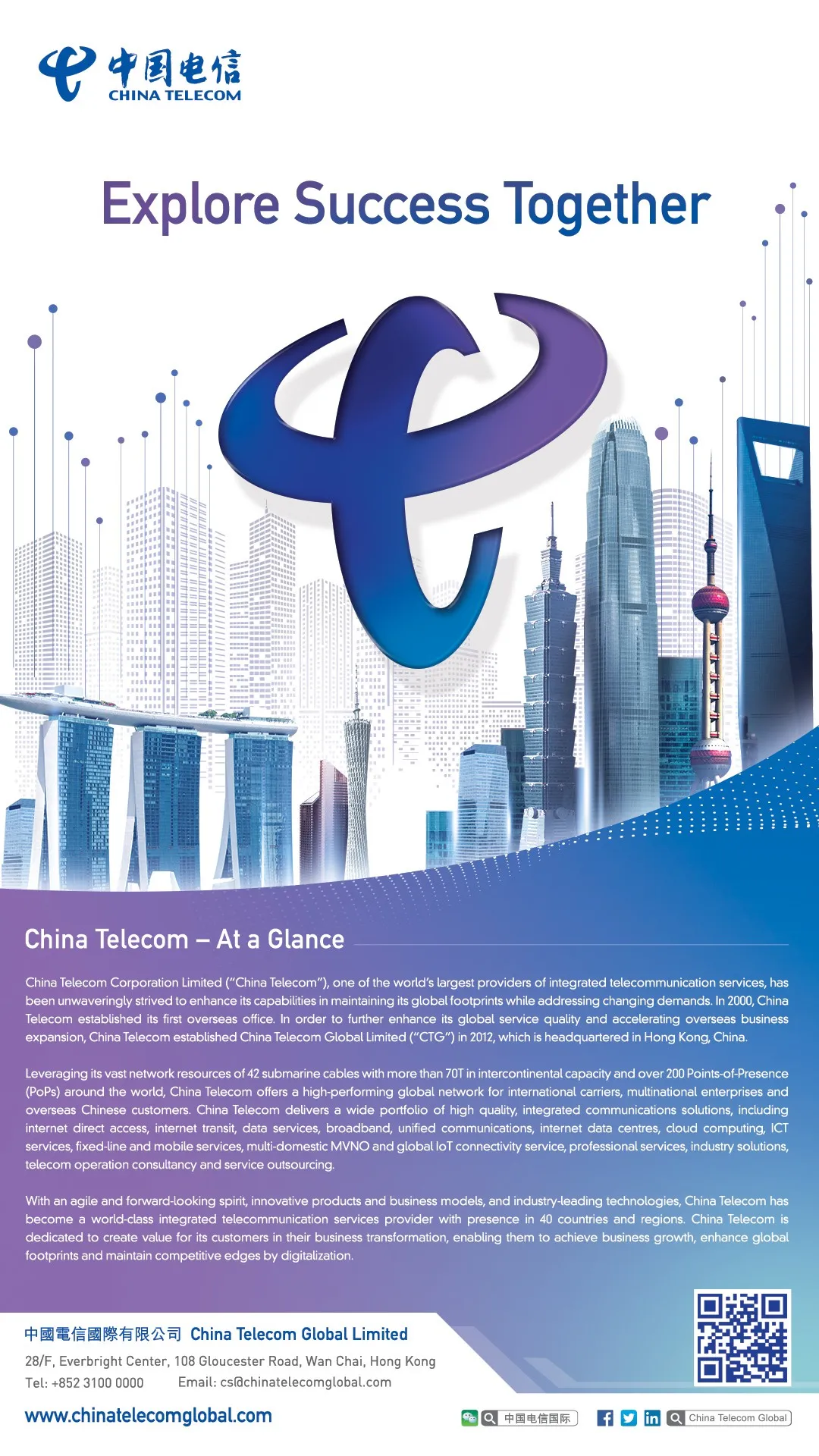 China Telecom Global Limited (“CTG”) is a wholly-owned subsidiary of China Telecom Corporation Limited (“China Telecom”), ranked 158th in the Fortune Global 500 in 2020. Established in 2012, headquartered in Hong Kong, China, CTG connects the Asia Pacific region and the world by leveraging on its abundant resources in mainland China. China Telecom has branches and affiliates in 42 countries and markets, 200 overseas PoPs, and more than 55.4T capacities in international connectivity bandwidth and intercontinental capacity. By tapping into its network resources of 41 submarine cables (China Telecom was involved in the construction of more than 10 of those cables) and leveraging direct connection to more than 10 neighbouring countries and regions via terrestrial cables, CTG has forged its global layout of service network and network capacity. Targeting carriers, multinational corporations and overseas Chinese clients, CTG provides customised and cost-effective integrated communications solutions and diversified telecom services to cater to their global business needs. Its services include internet direct access, internet transit, data services, broadband, unified communications, internet data centre, cloud computing, ICT services, fixed and mobile voice and value added services, multi-domestic MVNO and global IoT connectivity service, professional services, industry solutions, telecom operation consultancy and service outsourcing.