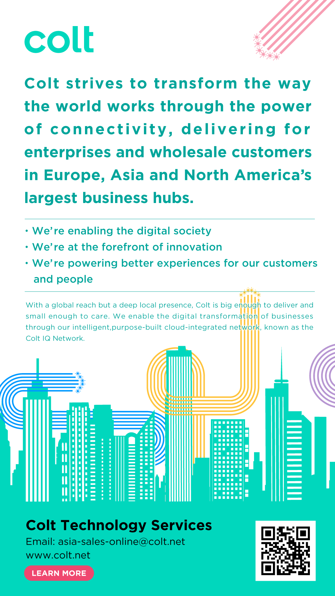 Colt strives to transform the way the world works through the power of connectivity. The Colt IQ Network connects 900+ data centres across Europe, Asia and North America’s largest business hubs, with over 29,000 on net buildings and growing.