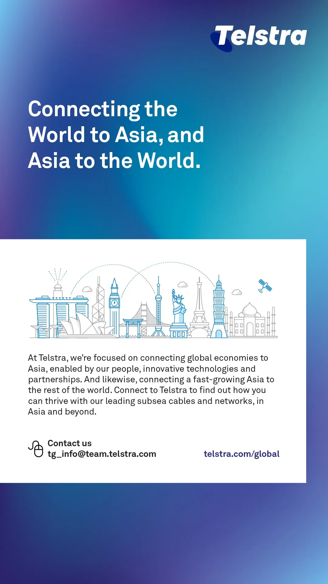 Telstra is a leading telecommunications and technology company with a proudly Australian heritage and a longstanding, growing international business. Today, we operate in over 20 countries outside of Australia, providing services to thousands of business, government, carrier and OTT customers. Telstra Enterprise is a division of Telstra that provides data and IP networks and network application services, such as managed networks, unified communications, cloud, industry solutions and integrated services. These services are underpinned by our subsea cable network, one of the largest in the Asia Pacific region, with licenses in Asia, Europe and the Americas, and access to more than 2,000 Points-of-Presence around the world.