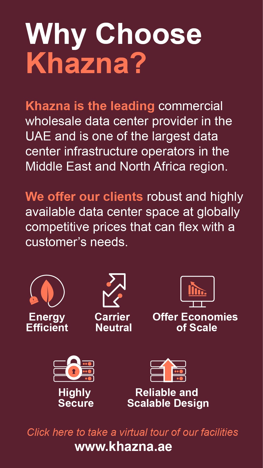 Khazna – meaning ‘Safe’ in Arabic – provides organizations with dedicated commercial wholesale data center solutions to meet the demands found in today’s competitive and transforming business environment.