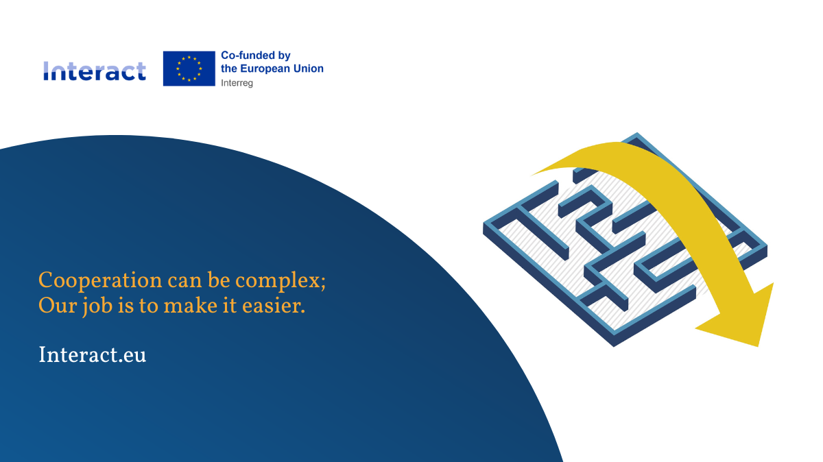 Interact is an interregional cooperation programme, co-funded by the European Union. It helps Interreg programmes, and other actors working in a cooperation context, to be more efficient and more effective, to achieve more with EU funds. Interact has supported Interreg for more than 20 years, and continues to offer bespoke interventions to address the key challenges facing Interreg programmes and other cooperation actors in working in a complex environment. Interact’s services are targeted at cooperation programmes under the European Territorial Cooperation objective of Cohesion Policy.