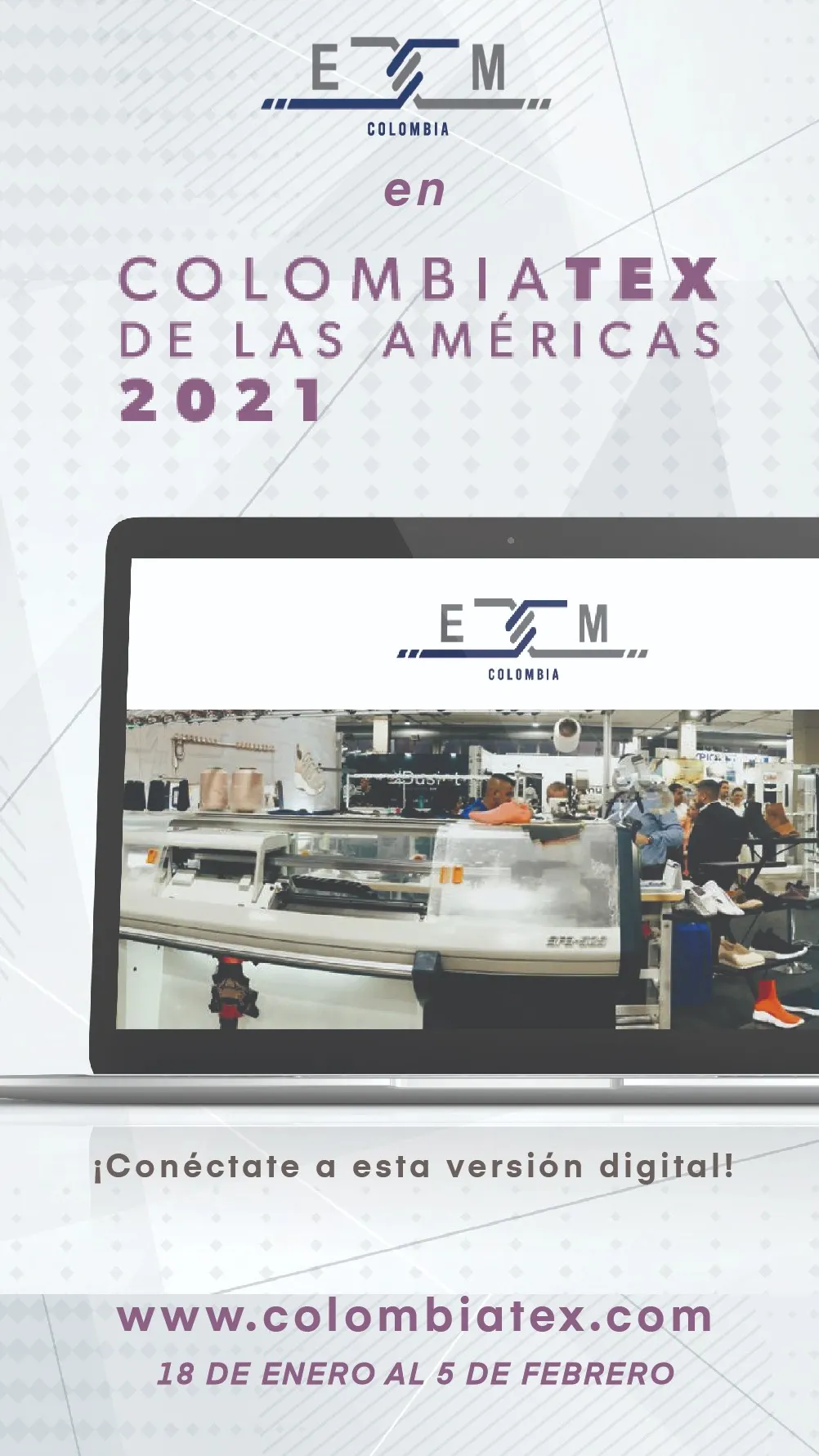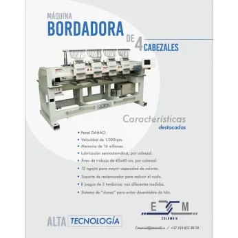 ETM Colombia es una empresa dedicada a la venta y distribución de maquinaria e insumos para la industria textil con más de 20 años de experiencia, enfocada en brindar lo ultimo en tecnología; con un amplio portafolio de maquinas para todo el área como: confección, cortadoras laser, bordadoras, tejedoras rectilíneas, tejedoras circulares, plotter, extendedoras automatizadas de tela, corte automatizado, maquinara de cubrebocas, inyección a la eva, fibra óptica para el desgaste del denim, patronaje y corte; hemos llevado maquinaria a muchos rincones del mundo Colombia, México, Guatemala , Cuba, Chile entre otros.