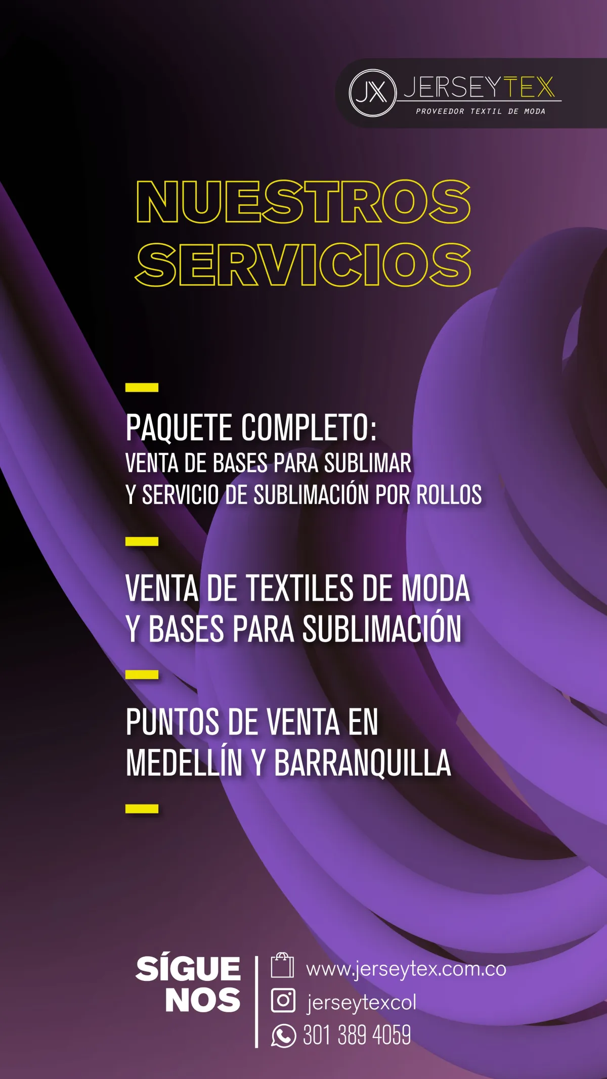 SERVICIO DE PAQUETE COMPLETO: VENTA DE BASES PARA SUBLIMAR Y SERVICIO DE SUBLIMACIÓN POR ROLLOS. VENTA DE TEXTILES DE MODA. PUNTOS DE VENTA EN MEDELLÍN, BARRANQUILLA Y PERU.