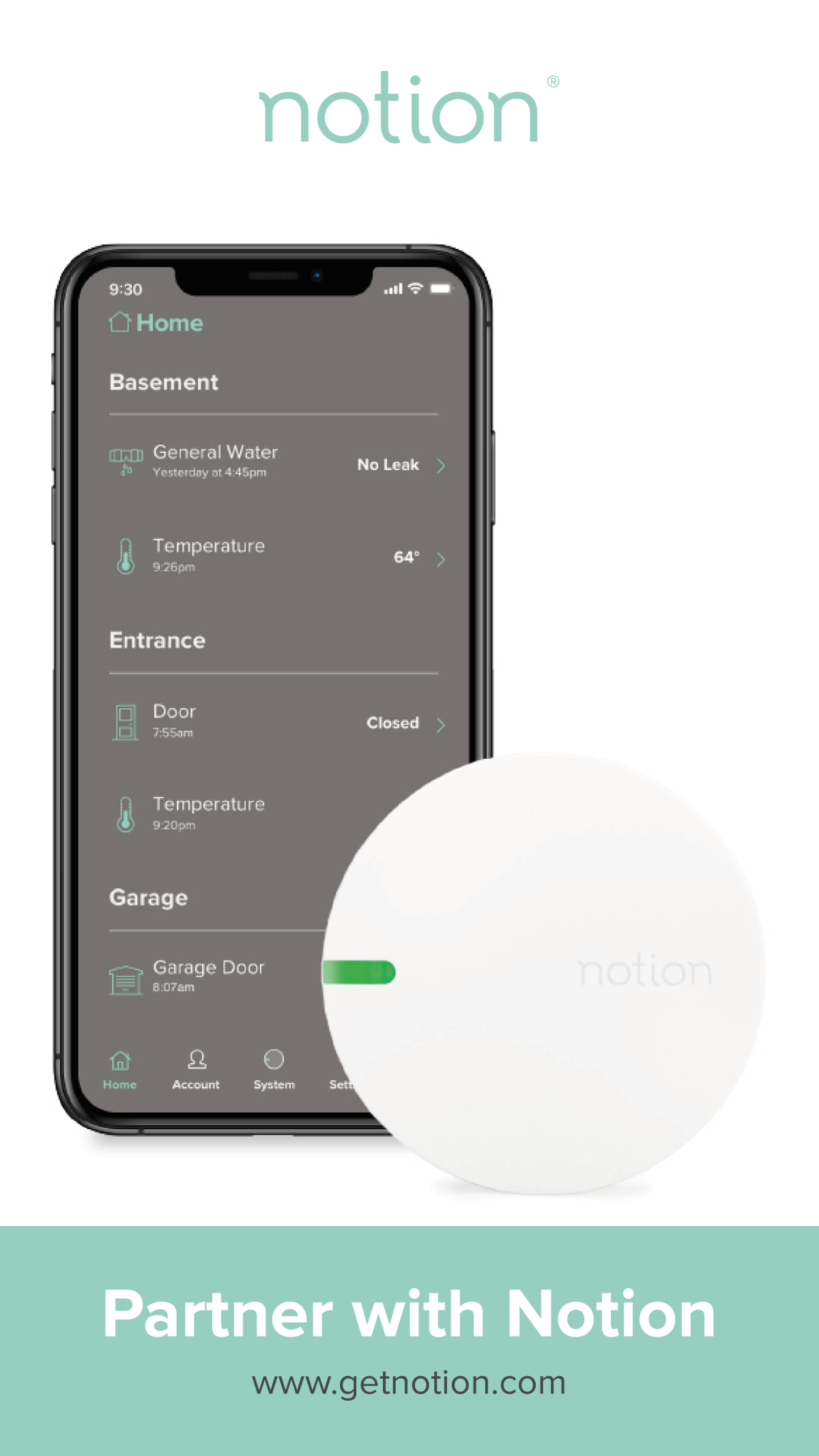 Notion is the leading partner for smart property monitoring. Notion partners with insurance and service providers to support proactive maintenance and provide value-add smart technology to their customers. Powered by multifunctional sensors and an app, the Notion system delivers notifications to a property owner — empowering proactive monitoring to de-risk a property.