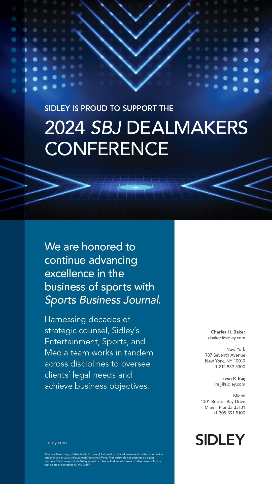 Sidley Austin LLP has one of the most active and accomplished sports law practices in the world. Our sports team has decades of experience providing strategic advice to an enviable list of domestic and international sports clients — from iconic franchises and governing entities to media power players and high-profile investors. Our lawyers, strategically situated in major business and regulatory hubs such as Los Angeles, New York, Miami, and London, leverage the firm’s 2,300-lawyer global platform to support our clients. Our legal work encompasses record-setting M&A and private equity transactions, complex billion-dollar rights deals, landmark stadium developments, innovative operating agreements, as well as top-tier regulatory counseling and advocacy.