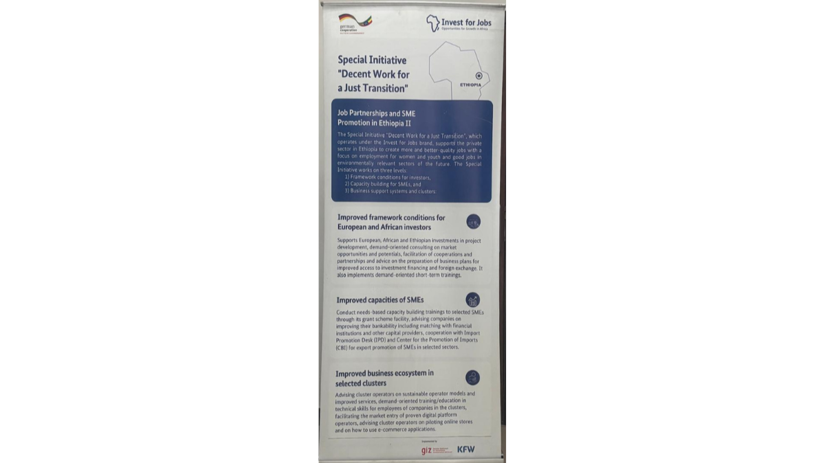 Selected SMEs receive tailored technical consultancy, management coaching, targeted equipment support, and facilitated access to finance, including bank loans, equity, innovative finance, and grants. The programme is implemented through close collaboration with Ethiopian stakeholders and financial institutions, ensuring demand-driven support and sustainability.