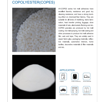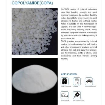 Whereas many of the polymer systems used today such as polyamides(copa), polyesters(copes) and polyurethane(tpu) were developed for the fusible interlining market and heat transfer printing. We are supplying tpu, copes,copa, eva, hdpe & ldpe with granule, powder, film and web.