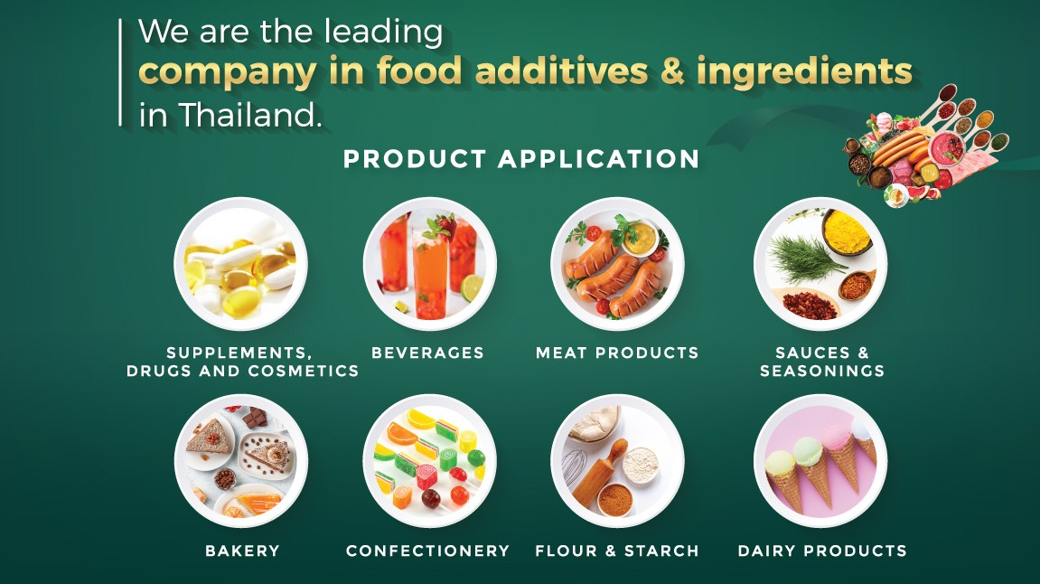 We are the leading company in food ingredients and additives in Thailand that import, manufacture and distribute Food additives and ingredients for Food, Beverage, Cosmetic and Drugs industries which meet the needs of customers, especially the innovative or functional ingredients.
