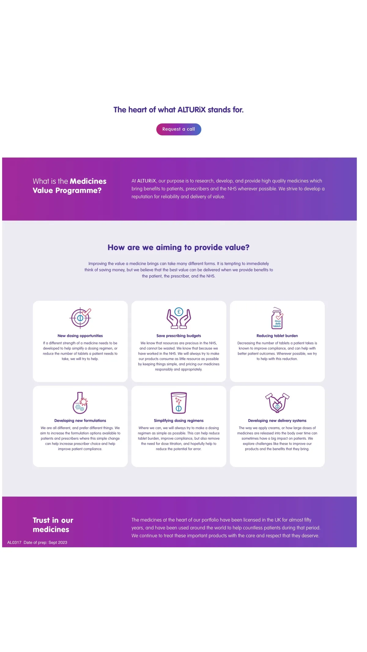 ALTURiX are a dynamic pharmaceutical company who are committed to building and nurturing meaningful partnerships with our customers. We are dedicated to delivering a growing portfolio of high quality products to help improve patient outcomes, at responsible prices. At the heart of our philosophy is the ALTURiX Medicines Value Programme (MVP). Our aim with MVP is to improve the value a medicine brings. It is tempting to immediately think of saving money, but we believe that the best value can be delivered when we provide benefits to the patient, the prescriber, and the NHS. To learn more please feel free to meet one of us at this Forum or you can find further information at https://mvp.alturix.com