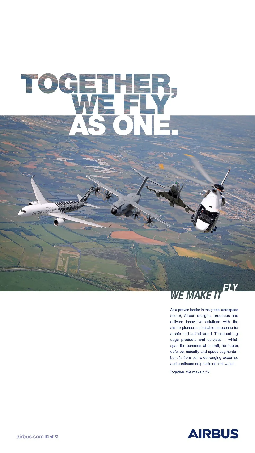 Airbus is an international reference in the aerospace sector. We design, manufacture and deliver industry-leading commercial aircraft, helicopters, military transports, satellites and launch vehicles, as well as providing data services, navigation, secure communications, urban mobility and other solutions for customers on a global scale.