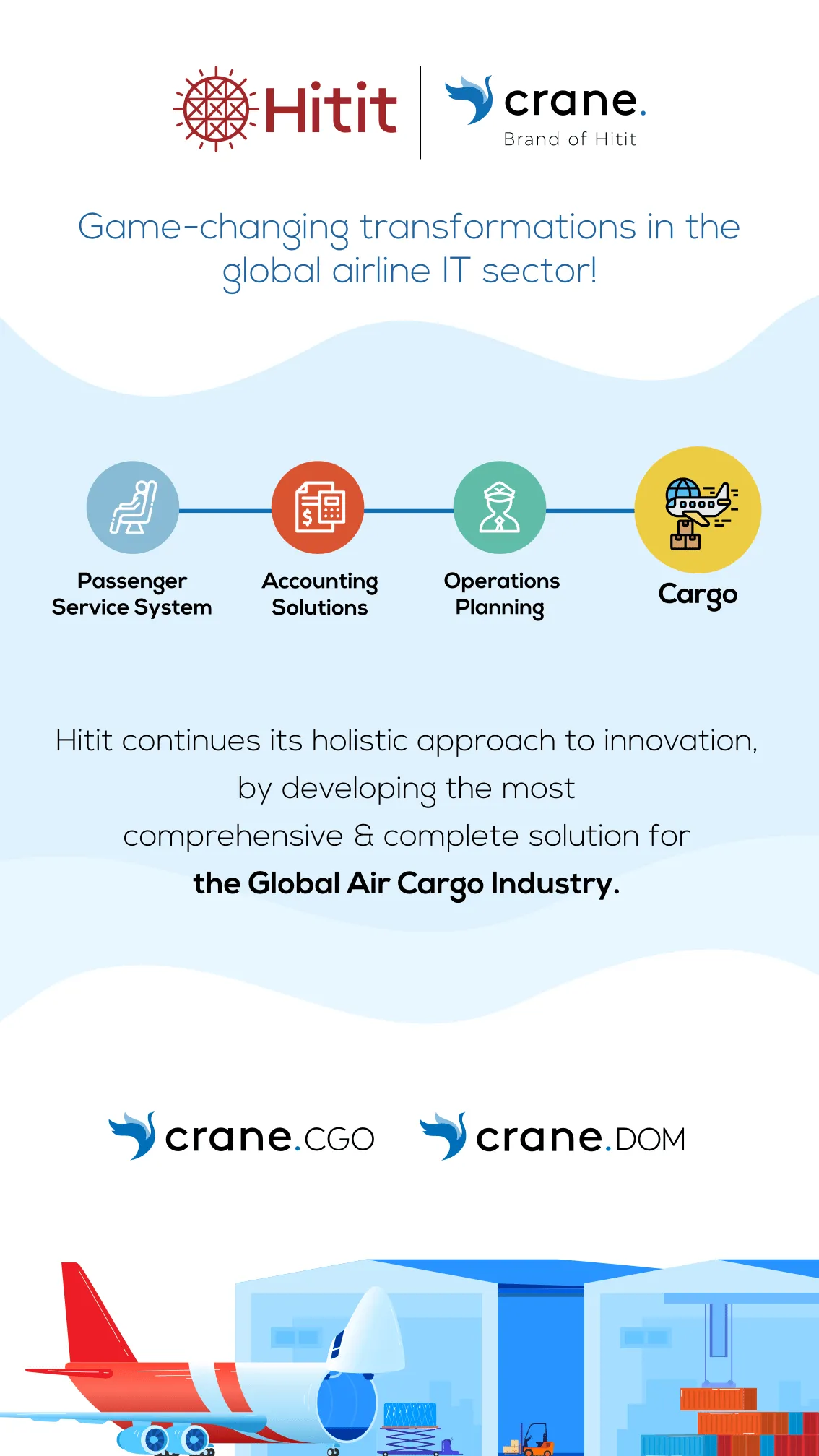 Hitit’s solutions and services provide its aviation industry partners with state-of-the-art technology for passenger services, operations, accounting, and cargo, among others. As the latest cargo solutions on the market, while crane.CGO provides the most comprehensive and complete solution for air cargo operations, crane.DOM is a modern turn-key service system that allows airlines and cargo handling companies to cover all aspects of domestic cargo operations.