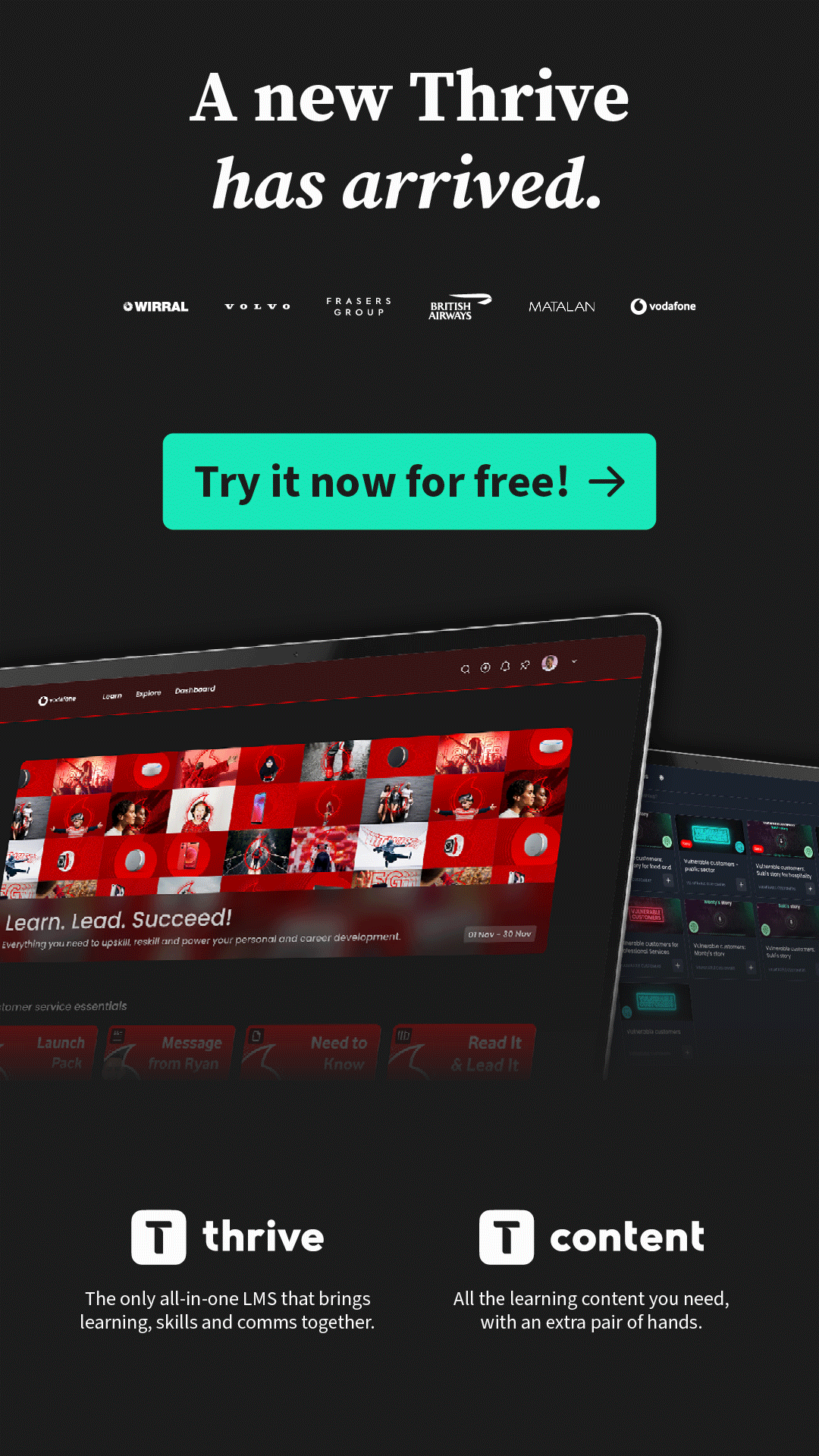 350+ modern companies like Volvo, British Airways, Sky, Frasers Group and Vodafone trust Thrive to power their people’s development and in turn experience increased employee engagement, improved sales, accelerated ramp-up times, reduced costs and more.