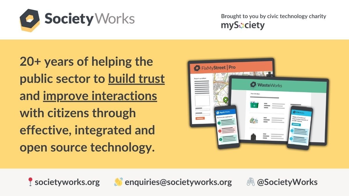 SocietyWorks is the wholly owned subsidiary of civic technology charity mySociety. We help local authorities and other public sector organisations better serve citizens through effective, integrated and intuitive digital solutions.