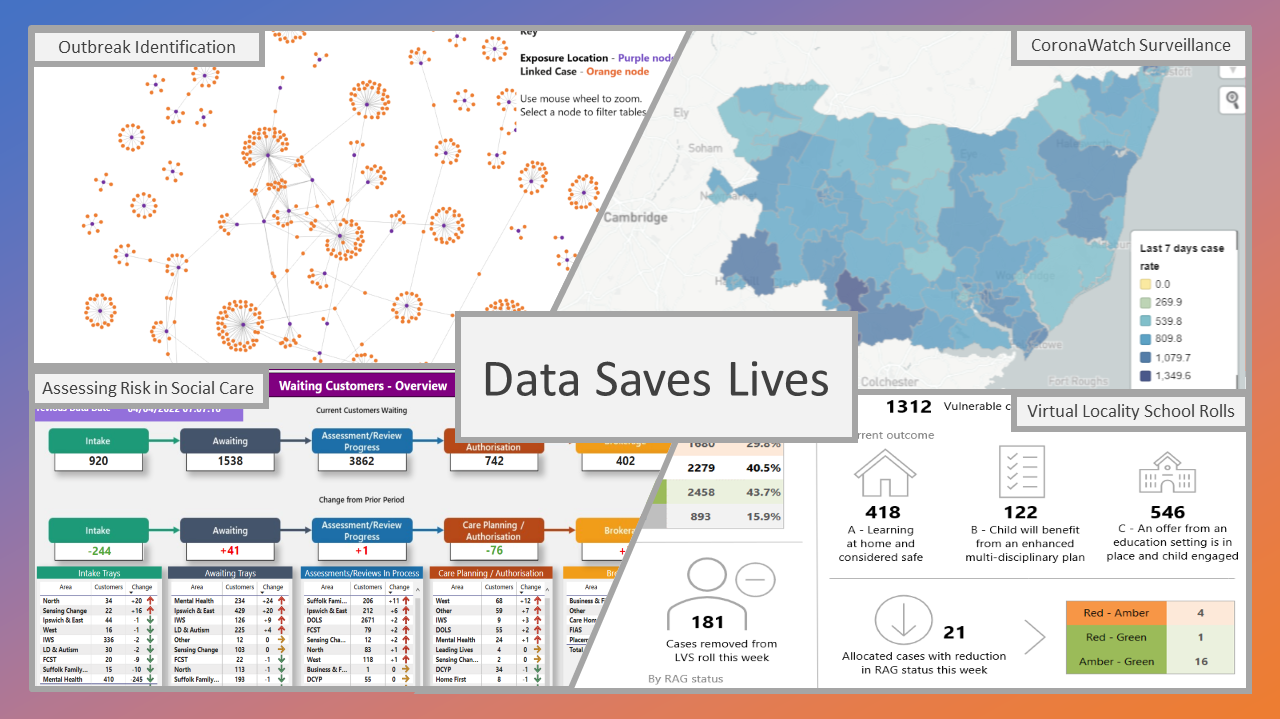 Suffolk CC and SODA have an ambitious vision where linked data and shared intelligence improve services and outcomes. Our data-led response to the pandemic saved lives and kept people safe across Suffolk. Key innovations included a vulnerable persons dataset which enabled over 10,000 proactive calls supporting residents; the automation of dataflows and creation of sophisticated epidemiological dashboards which drove the public health response; creating a virtual locality school roll which enabled staff to ensure our most vulnerable children were supported and safe in school; and a data-led risk assessment for all adult social care customers, enabling a risk-informed response.