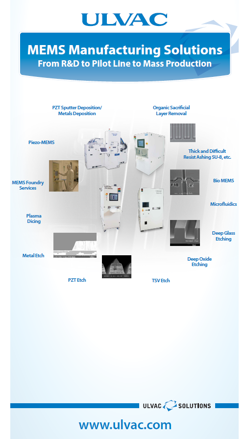 ULVAC is a comprehensive manufacturer of vacuum equipment and components, with extensive experience in the Semiconductor, Advanced Electronics, and Flat Panel industries. ULVAC offers a full suite of equipment for MEMS Manufacturing including our newly introduced Gemini cluster sytem for PVD, CVD, Etch, Ash and more.