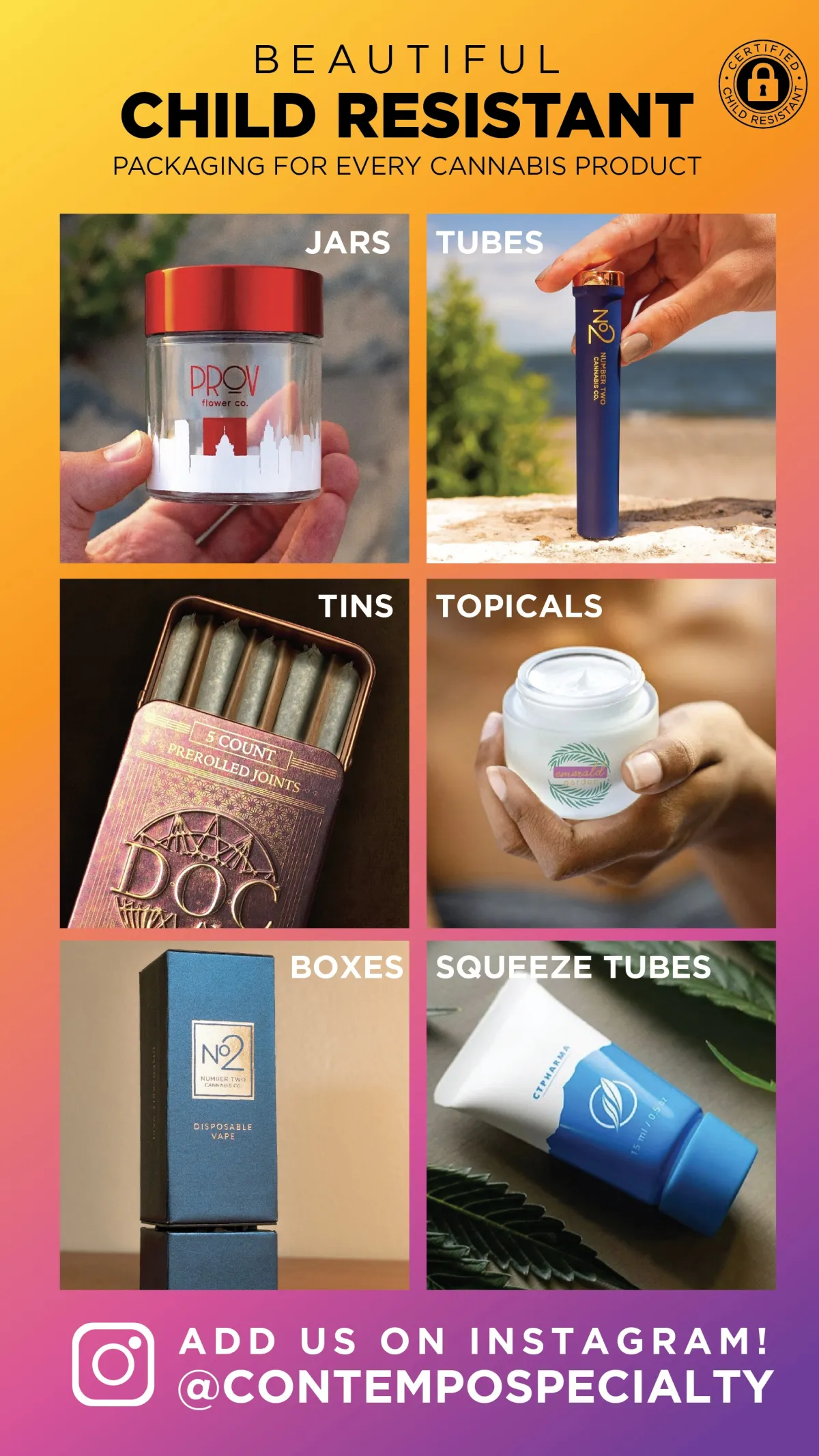 We manufacture beautiful and unique child resistant packaging for EVERY cannabis product. From flower, prerolls, concentrates, edibles to topicals and more.