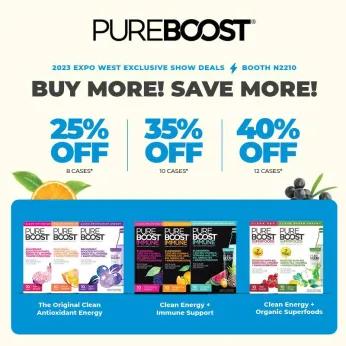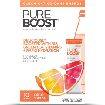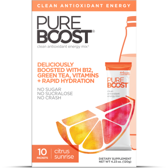 Say hello to Pureboost. A clean antioxidant energy mix with no sugar and no sucralose. Powerful, crash-free energy powered by 100 mg of green tea caffeine and B12 plus 25 vitamins, minerals and electrolytes.