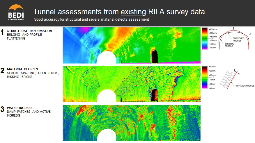 Designed by I. K. Brunel and opened in 1845, Sapperton tunnel is an approximately 2km long brick lined tunnel, which is distorting and deteriorating due to the complex geology in which it was constructed, as well as its age. Sapperton tunnel is a typical example of the over 900 operational tunnels, along 400km of Network Rail's routes, with an average age of approximately 150 years. Given the sheer number of tunnels on the Network and their age, rapid and accurate condition assessment of all these old tunnels is a safety-critical task for Network Rail. Trains operate at speeds in in the order of 100mph through these tunnels, and so debris on the tracks presents a real risk of derailment, as do deflecting tunnel linings into the running clearance of the trains. The main goal of this project was to develop a process that could improve safety through use of new and emerging technologies, and apply them specifically to asset management. With the age of the tunnels and increase in passenger numbers, track access availability is decreasing, meaning possessions to complete tunnel examination and maintenance are at a premium. As the current approach to asset condition assessment is slow and requires a significant amount of ‘boots-on-ballast’ man-power, Network Rail established the need for a new means of qualitative and quantitative assessment methods for masonry lined tunnels major elements, which would allow efficient planning of repairs, so increase safety across the routes. The innovative digital tunnel condition assessment project resulted in development of a novel assessment method and tools that are compliant with the manual visual process set out in Network Rail standard NR/L3/CIV/006/4C and currently in use. This makes it possible to use the new digital method immediately, without changing a tried and tested Network Rail assessment system on which decisions of remedial work are based. Innovative survey, processing, and visualisation techniques provide an assessment method whose key benefits are: Safety: Fewer man-hours on track reduce risk to operatives; surveying from track level minimises the need for high-level access, while providing accurate and photo-realistic data; UAV photogrammetry can replace man-access in shafts or where no safe access can be provided Accuracy: The extent and severity of defective areas can be objectively measured and scored reliably; Planning and costing: Data collection is flexible and less dependent on long or consecutive track access windows; accurate data improves estimate of defects extent and severity, improving costing and quality of estimates. Communication and interoperability: Clear graphical and tabular output improves communication between client and contractor de-risking the works This is the first time digital condition assessment has been used to this extent on a 'live project'. Bedi Consulting & Network Rail working together trialled and developed practical systems to enable existing technologies to be tailored and immediately applied to tunnel condition assessment, and proved incredibly successful on the Sapperton Tunnel trial project. Network Rail now intends to continue using this technology across their assets and see this as the future of undertaking tunnel condition assessments.