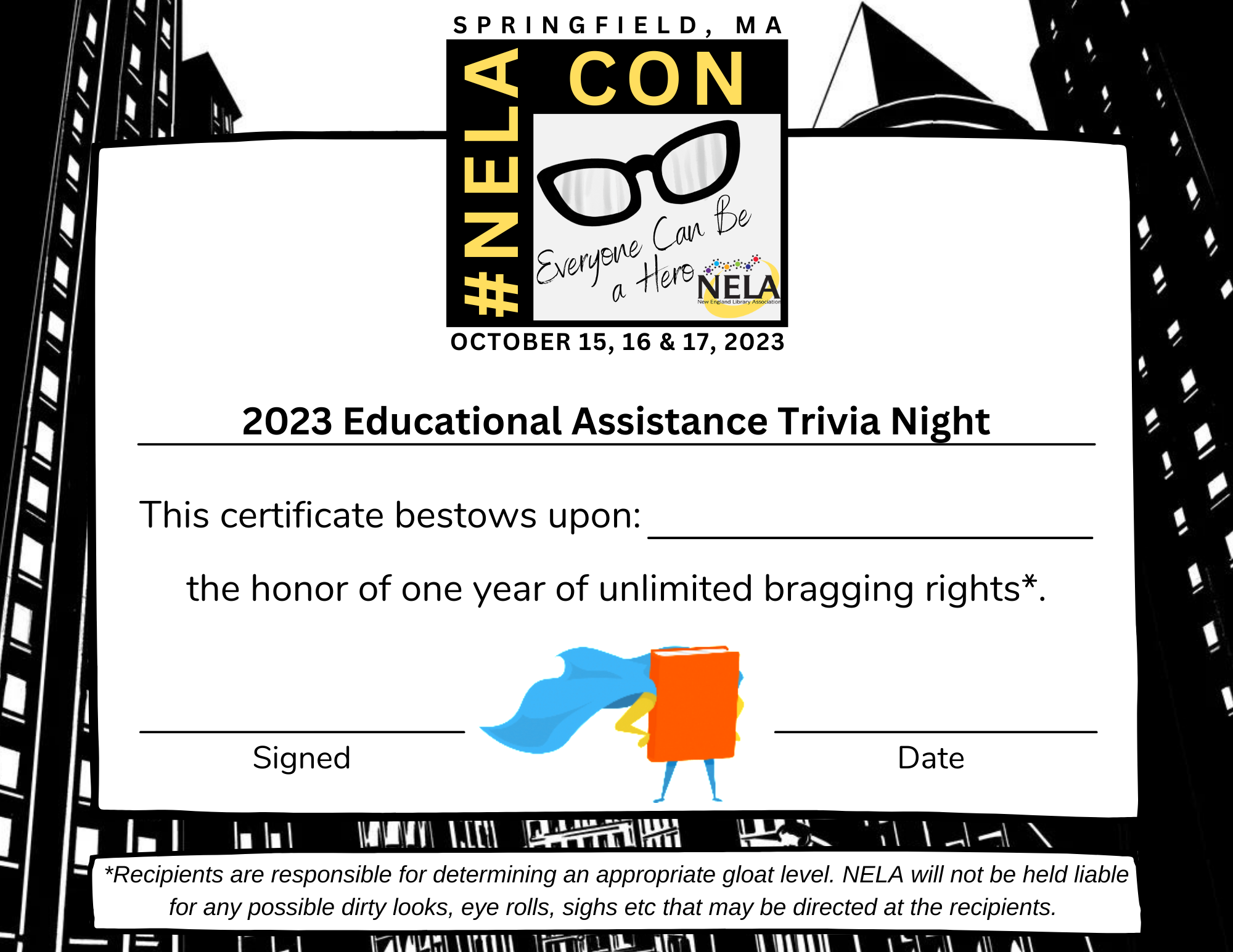 *Please note, winners are responsible for determining an appropriate gloat level. NELA will not be held liable for any possible dirty looks, eye rolls, sighs etc that may be directed at the winners.
