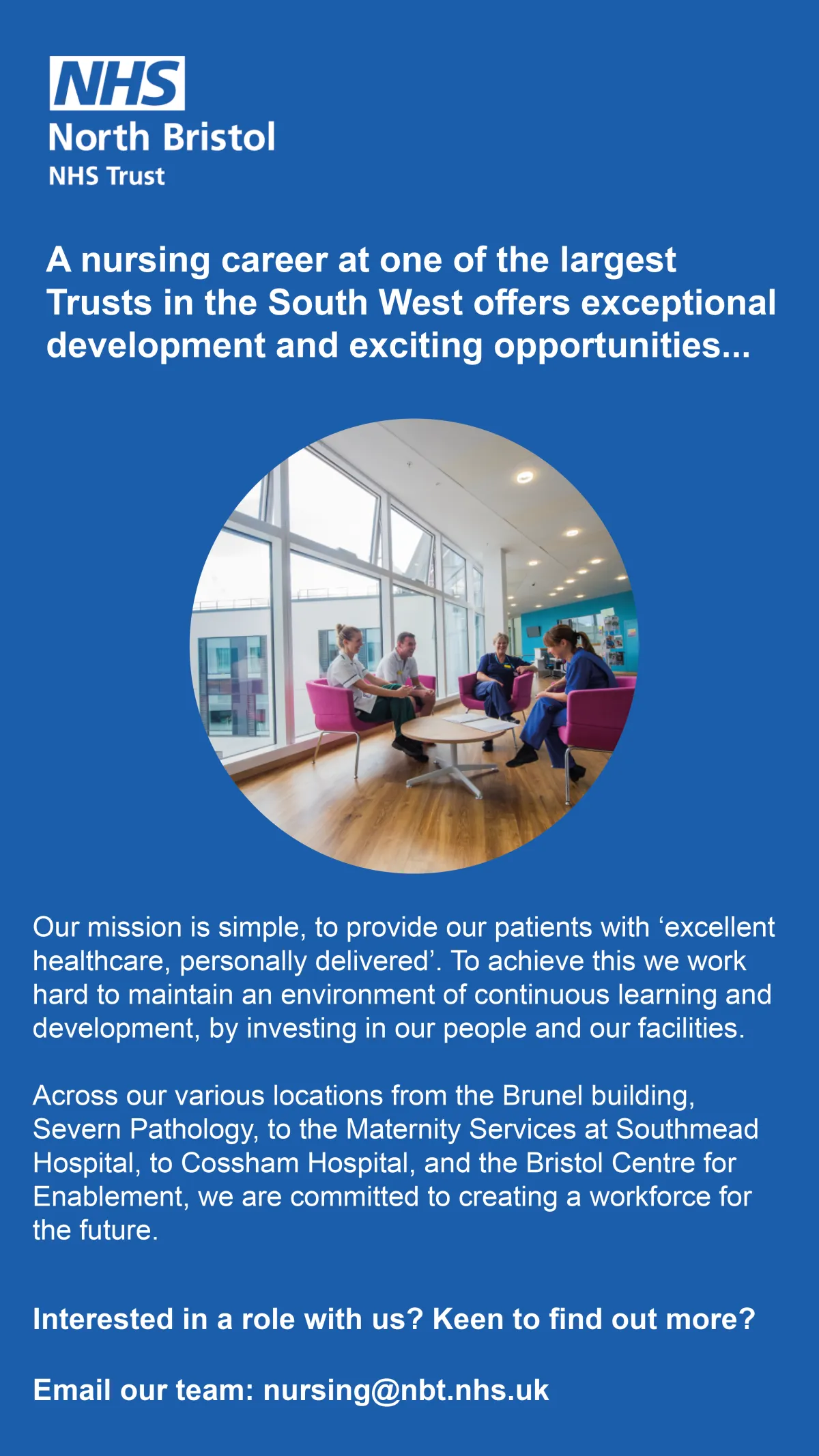 As part of our Trust, you’ll have access to unique multidisciplinary training delivered by an in-house perioperative simulation team within a purpose built simulation facility; our clinical simulation space. We support and care for every member of staff, every carer, every visitor, and will always put the patient first. We recognise the person, and treat each one with dignity and respect. We are OneNBT.