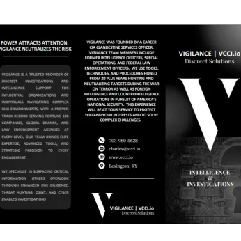 Vigilance is a private intelligence and investigative services company. We specialize in advanced and enhanced open source intelligence operations in support of due diligence, online risk assessments, and risk mitigation. We are staffed by former intelligence officers, special operators, and federal law enforcement agents. We provide services to Fortune 500 companies, High Net Worth Individuals, Family Offices, and Law Firms. Our services are discreet, effective, and tailored to our client needs.