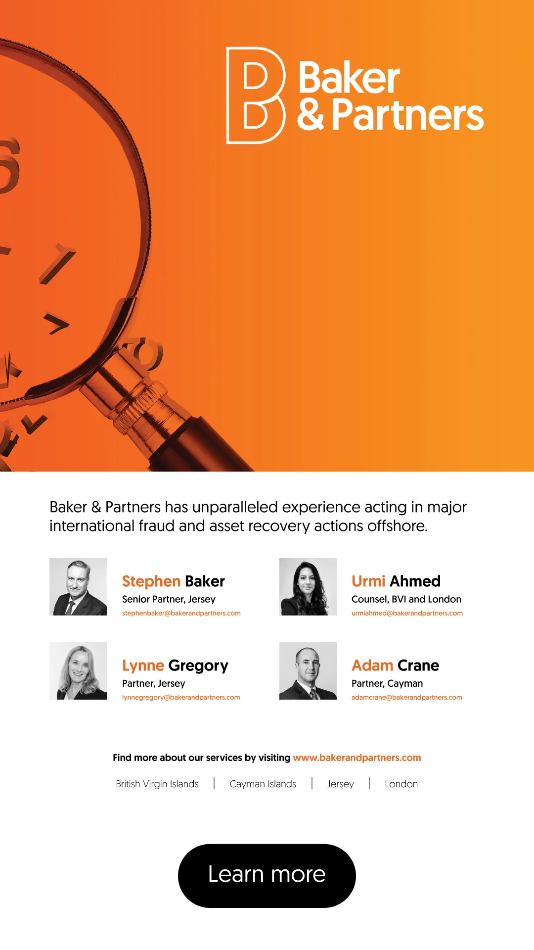 For over 20 years, Baker & Partners has been at the forefront of some of the most complex and high value offshore commercial and trust litigation. Baker & Partners is unique among offshore law firms in being led by a partnership of very experienced courtroom advocates who have between them conducted a very large number of trials in England, Jersey, the Cayman Islands and the BVI.