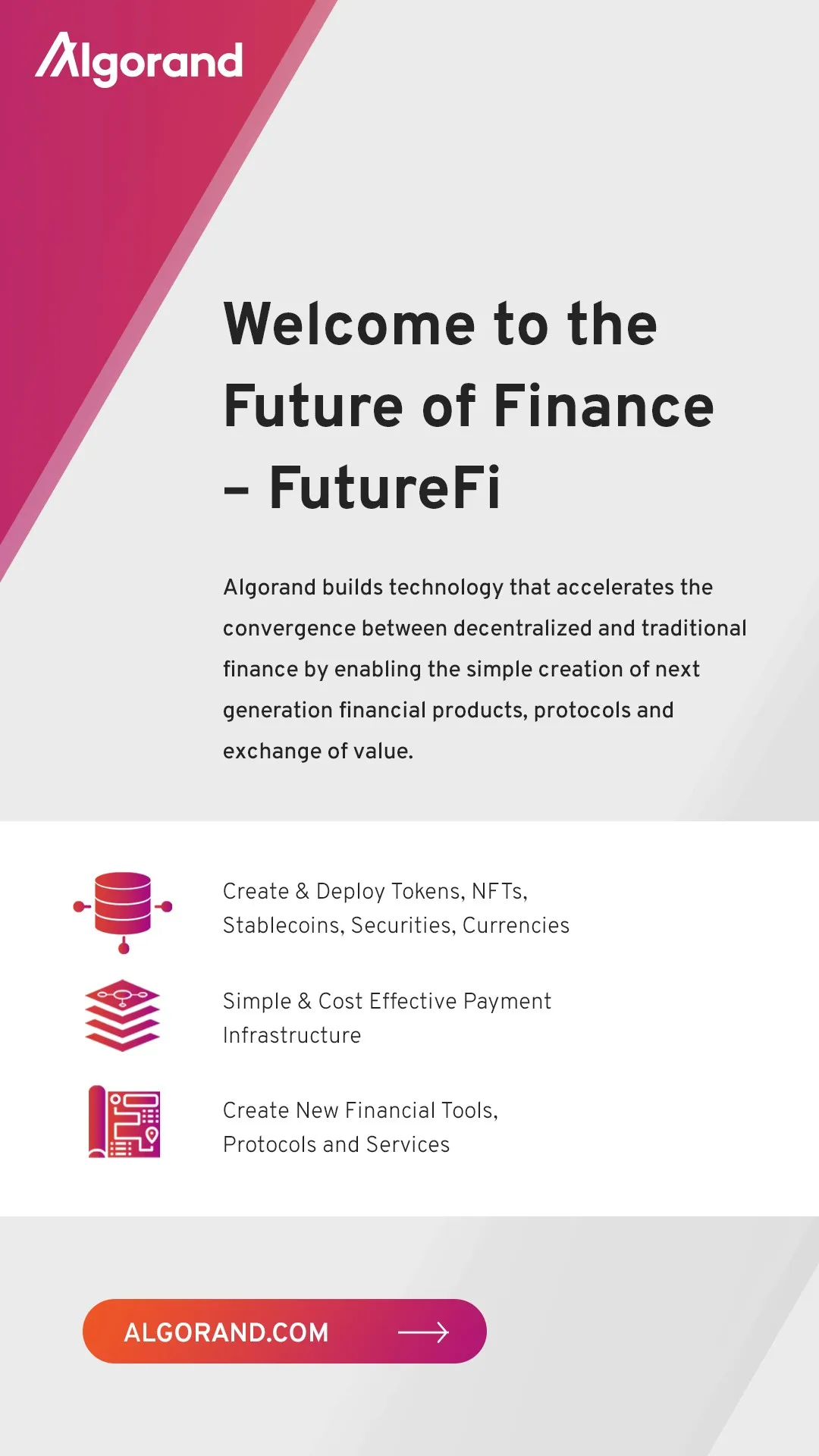 Algorand created the world’s first pure proof-of-stake foundational blockchain designed for the future of finance. Beyond the elementary requirement of an open, public network, Algorand’s technology enables a set of high performing Layer-1 blockchains that provide security, scalability, complete transaction finality, built in privacy, Co-Chains, and advanced smart contracts that are essential in a FutureFi world.