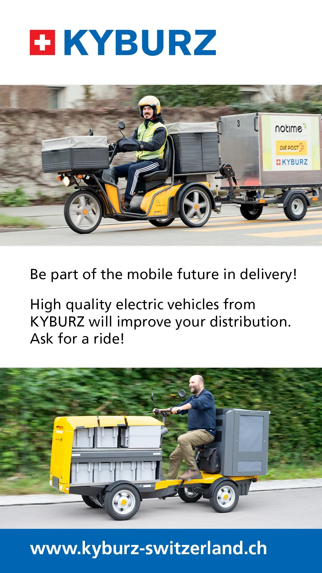 KYBURZ Switzerland AG develops and produces high-quality electric vehicles for delivery companies, industrial companies, municipalities and private individuals. The 3-wheeled KYBURZ electric vehicles for postal delivery have become an integral part of the road scape in many countries. KYBURZ is an international leader in high-quality mobility and transport solutions for the last mile.