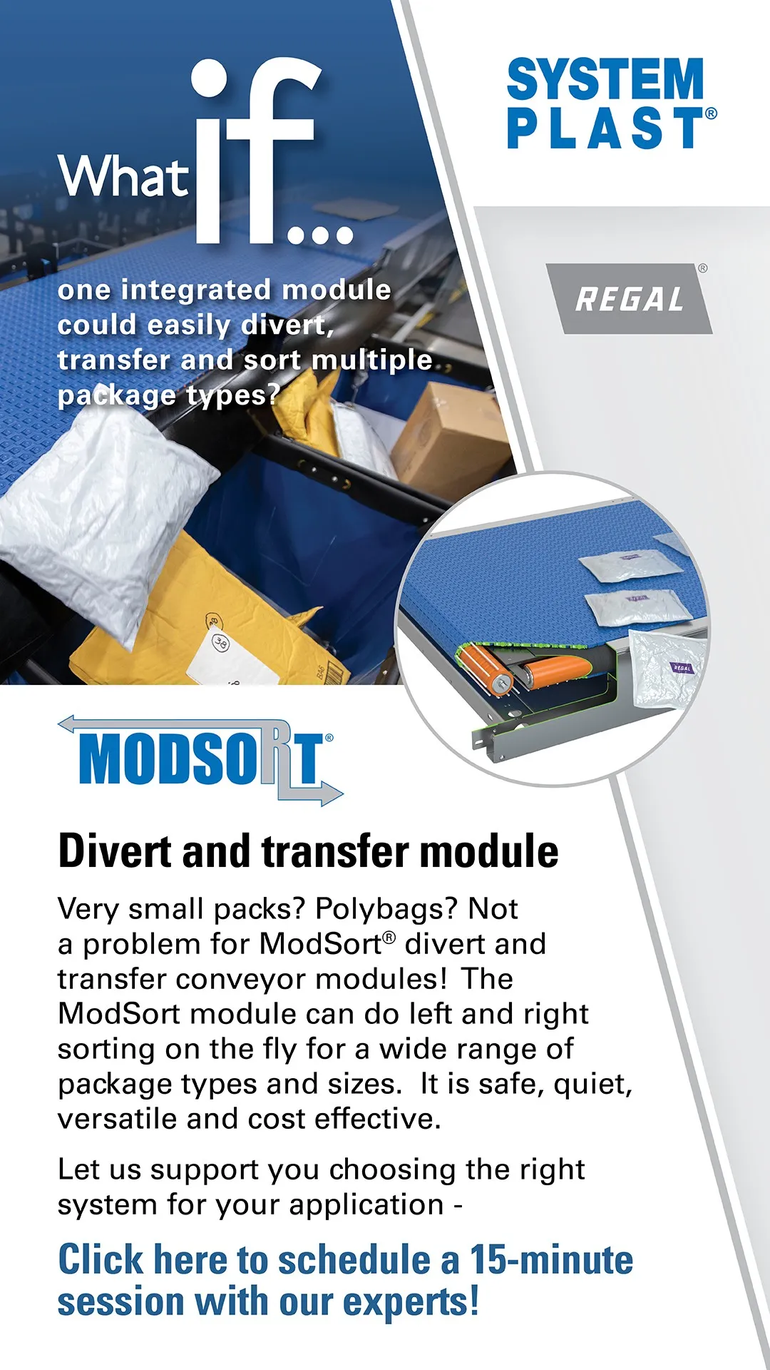Conveyors all over the world have utilized System Plast® engineered plastic conveying chains and chain tracks, modular plastic belts and Valu Guide® conveyor components and guide rails since 1985. The newest innovation is the System Plast® ModSort® divert and transfer module – a low-noise, low voltage modular transfer/diverter station that can move everything from tiny polybags to boxes. The ModSort suite of products can divert on the fly or stop and divert at a true 90-degree angle. It can easily integrate with new or existing systems, eliminating the need for a lift, pneumatics, or Z-direction position feedback devices. Motorized drive rollers and controls allow flexibility in wiring, with safe, efficient, quiet and low-maintenance operation.