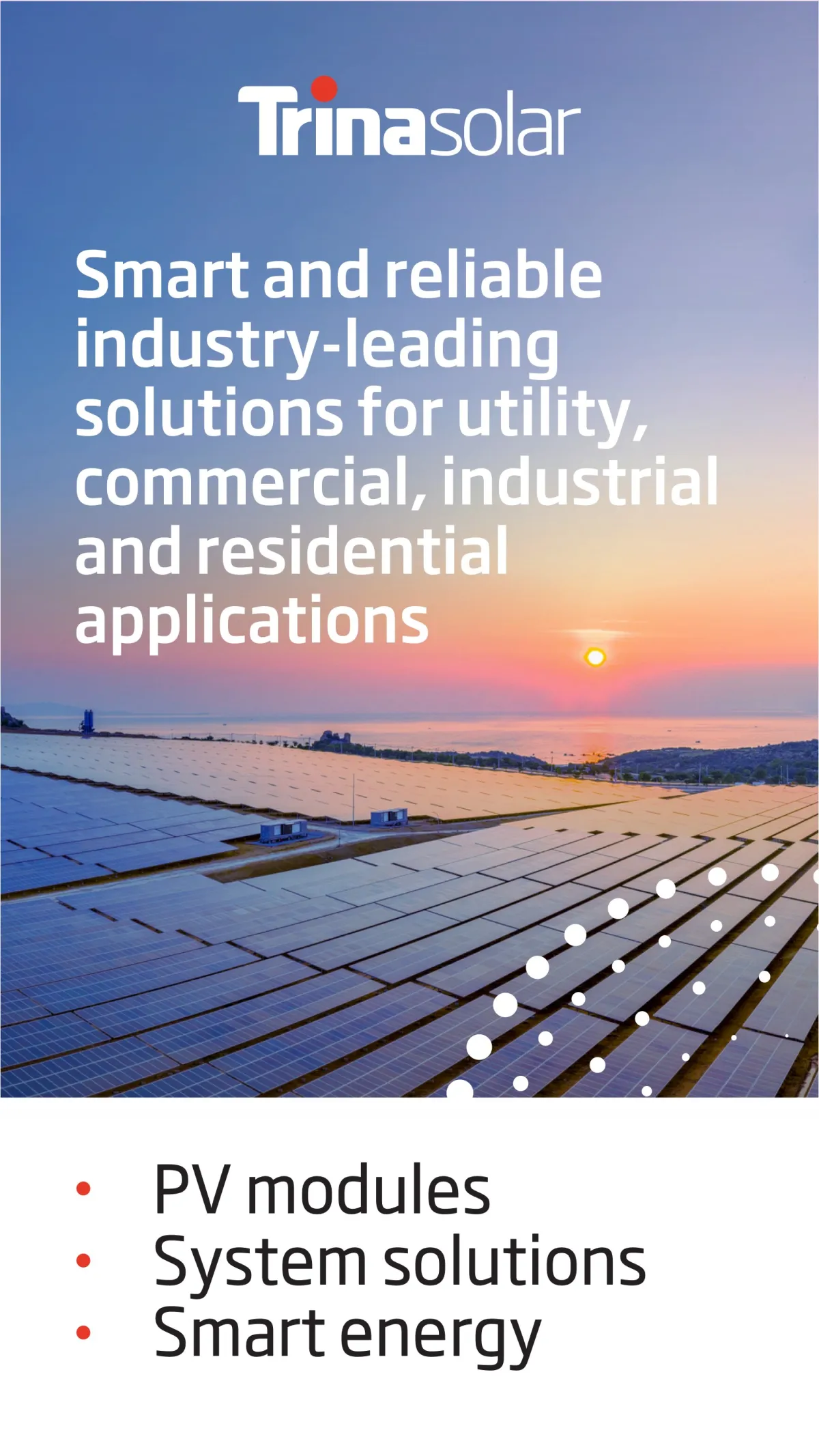 Trina Solar is a leading global total solutions provider for solar energy. Founded in 1997, Trina Solar develops proprietary smart PV solutions for large power stations as well as commercial and residential solutions, energy storage systems and photovoltaic modules. As the world's leading provider of integrated solar energy solutions, Trina Solar has taken the lead in evolving into a brand in the world of energy IoT (internet of things) and is committed to becoming a global leader in this new and emerging sector. For more information, please visit www.trinasolar.com