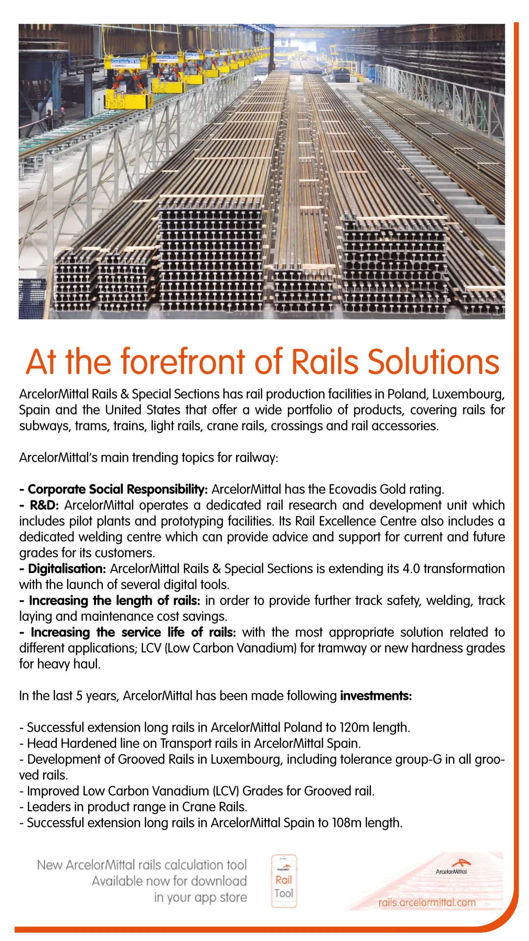 ArcelorMittal is the world's leading steel and mining company, with a presence in 60 countries and primary steelmaking facilities in 18 countries. Our goal is to help build a better world with smarter steels. Steels made using innovative processes which use less energy, emit significantly less carbon and reduce costs. ArcelorMittal offers a wide portfolio of products covering rails for subways, trams, trains, light rails, crane rails, crossings, rail accessories. To meet the future requirements of the rail industry, ArcelorMittal is engaged in continuous improvement of its product range, through the development of new types of rails and welding techniques.