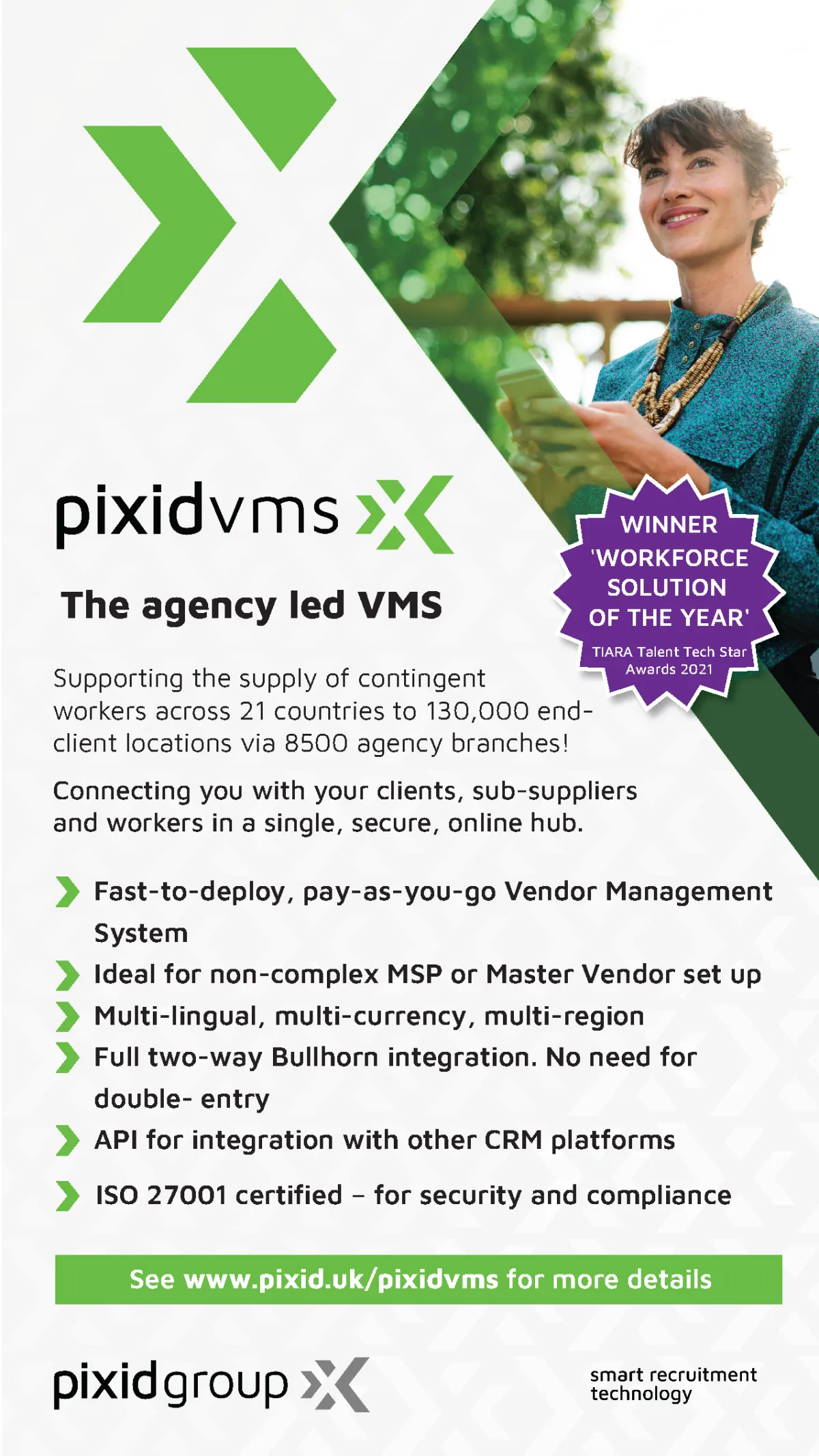 Our flagship product, Pixid VMS, is a fast to deploy, mid-market VMS capable of providing end-to-end visibility and control of contingent workforce processes. It is deployed by around 8500 agencies to more than 130,000 client locations across 38 countries, processing an average of 250,000 workers a day.
