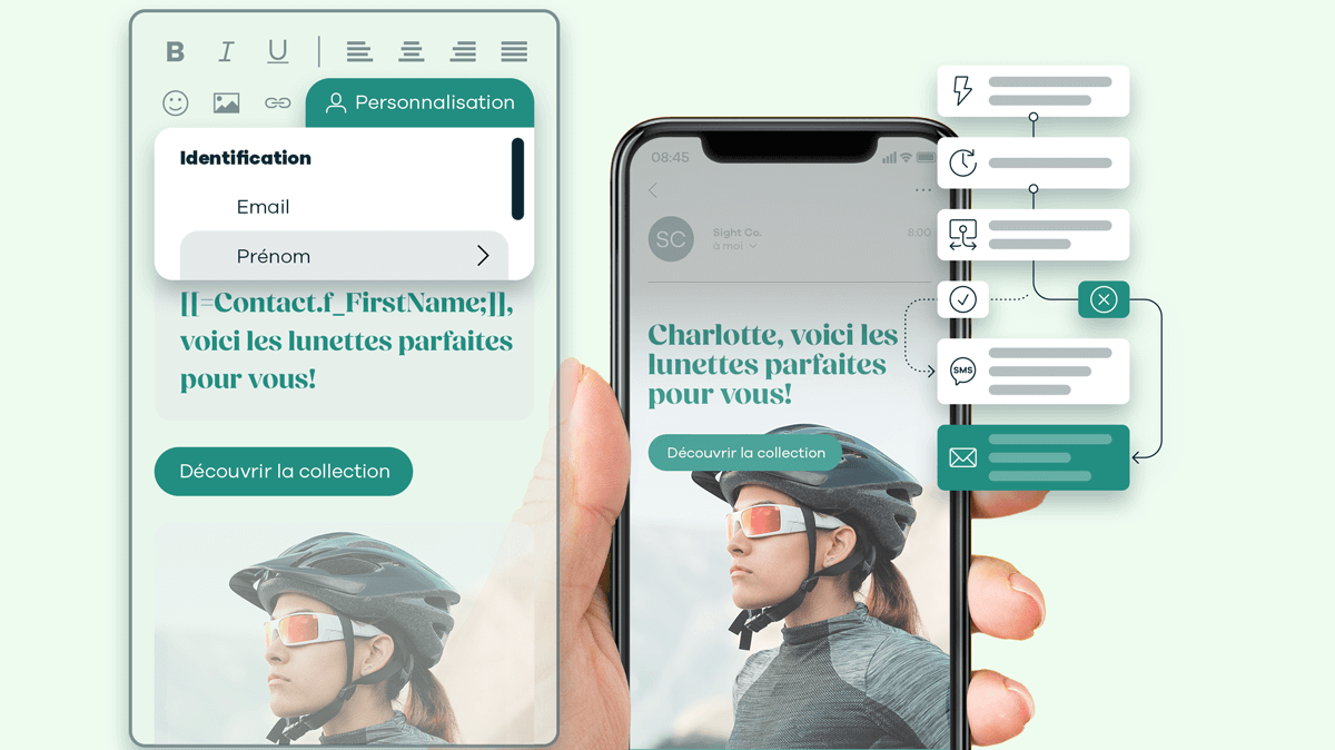 - Créez des campagnes fluides sur email, SMS, push et web personnalisé