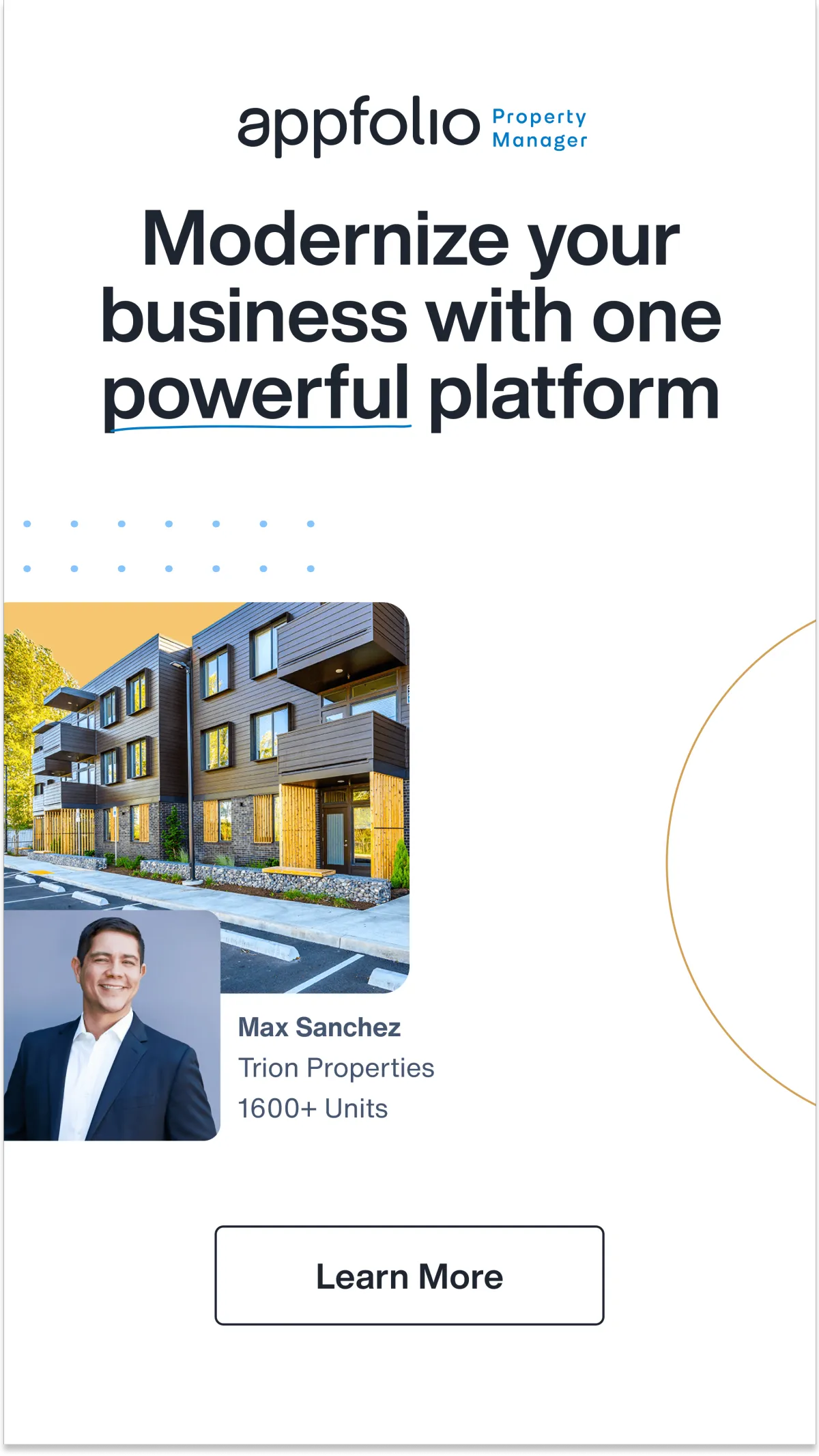 Run your entire portfolio on one modern platform. AppFolio’s intuitive and user-friendly experience gives your property management team the tools they need to provide excellent service to residents and owners. Whether you manage multifamily apartment complexes, single-family homes, or community associations, our software has everything you need to streamline and grow your business. Finally, property management software that gives you the clarity to focus on what matters most. With AppFolio, you’ll always have a finger on the pulse of your business and never miss a beat in reaching your goals. Discover what AppFolio can do for you at www.appfolio.com