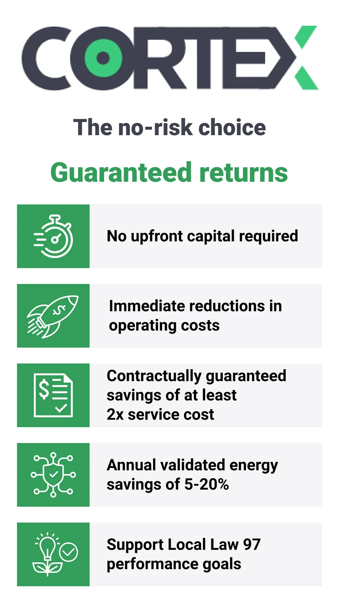 Cortex dramatically improves how buildings operate, allowing Cortex to guarantee significant net reductions in operating cost and CO2 emissions with no up-front integration cost. The Cortex RTEM (Real-Time Energy Management) platform extends well beyond typical RTEM tools. Cortex software applies proprietary machine learning algorithms to thousands of points of BMS data every fifteen minutes, as well as to meter data, utility bill information, local weather forecasts, and occupancy data. Cortex’s suite of algorithms can process and analyze information in a way that human teams simply cannot. Clear, real-time operating insights are delivered directly to building engineers through a powerful mobile app and through any internet browser, empowering them with information to improve operating efficiency and tenant comfort.