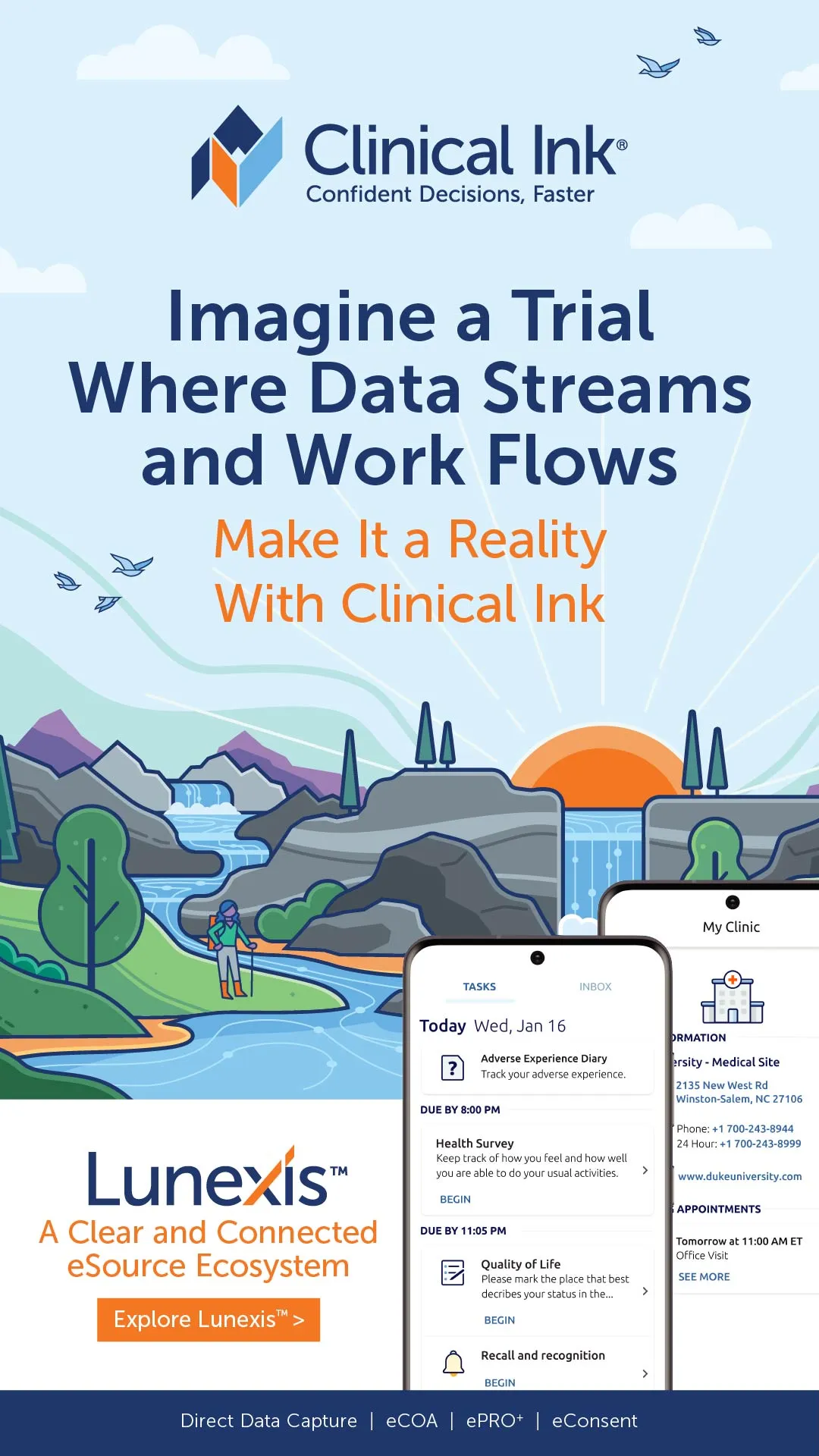 Clinical Ink, a global clinical technology company, offers data certainty from source to submission. Our eSource clinical technology and configurable ePRO and eCOA modules — a suite of solutions for capturing and integrating electronic data from sites, clinicians, and patients at its source — naturally enhance your clinical trial workflow by reducing manual labor, providing anytime, anywhere data access, and saving resources as your trials progress. Accelerate the completion of key clinical development milestones in your study and confidently manage your trial’s critical decisions with our flexible menu of collaborative services, remote monitoring support, and a complete, real-time view of your trial. To learn more, visit www.clinicalink.com