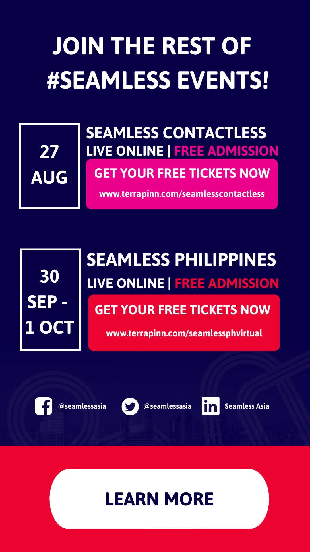 Welcome to Seamless Asia Virtual, the first virtual event on the future of commerce in Asia. We bring together Asia's banking, fintech and e-commerce communities and their partners.In just two days, we're bringing you insights from over 100 expert speakers across 6 conference tracks. Join our presentation sessions, live panel discussions and "Town Hall" sessions and learn from our blockbuster speakers. Make sure you also visit the virtual Exhibition and meet our fantastic partners whose products and technologies can help elevate your business to new heights.