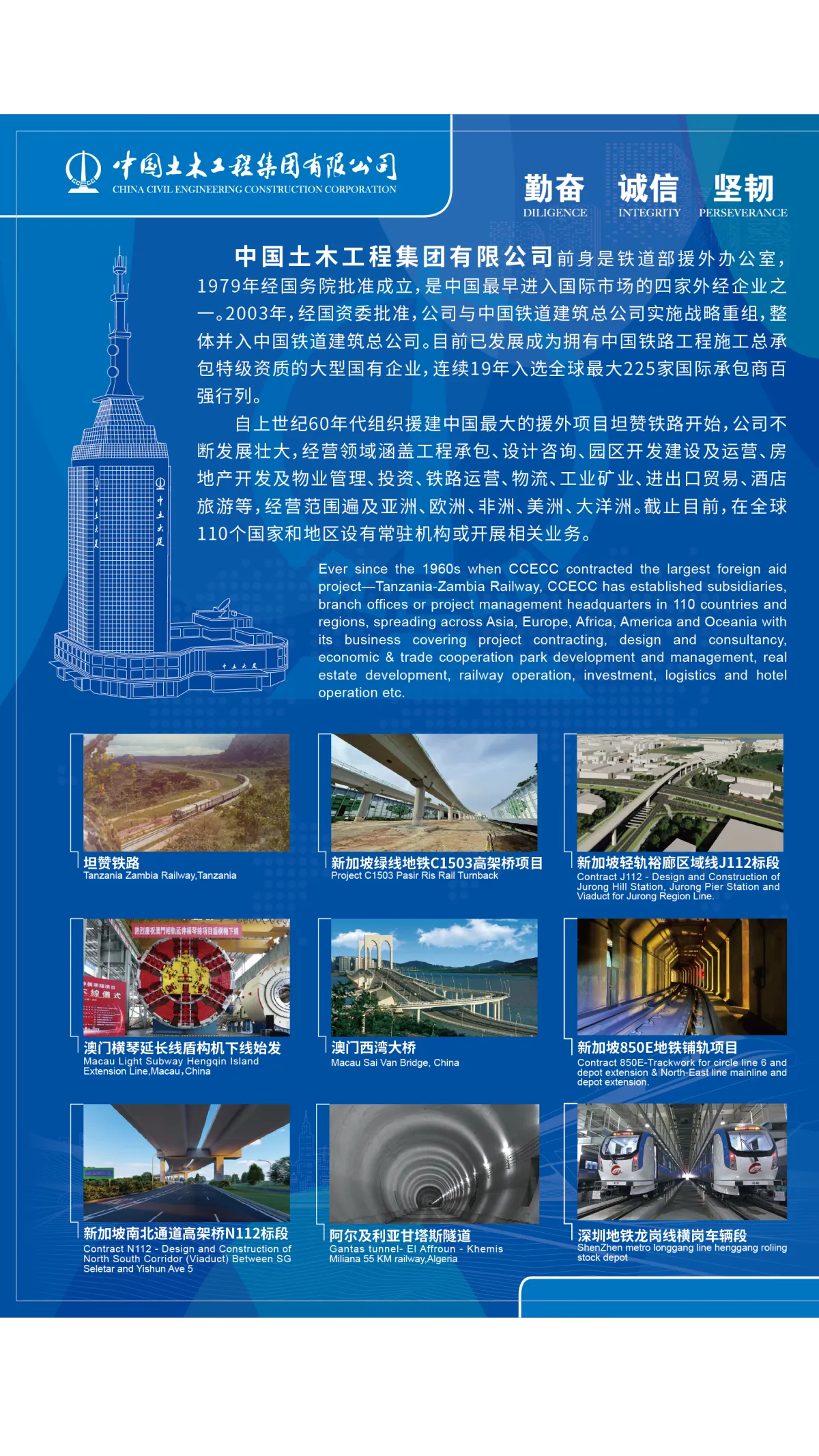 China Civil Engineering Construction Corporation (CCECC) was established in June 1979, with 43 years development, CCECC has developed into an enterprise with Chinese National Super Grade Qualification for railway project contracting and has established subsidiaries, branch offices or project management headquarters in 110 countries and regions with its business covering project contracting, design and consultancy, real estate development, railway operation, investment, logistics and hotel operation etc.